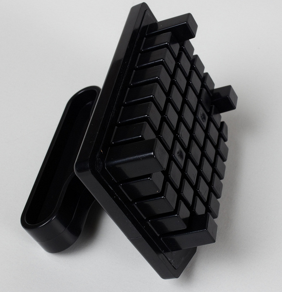 И самая новая и интересная по конструкции насадка в большой чаше — приспособление для резки кубиками. Это толстый диск из черного пластика с прямоугольным решетчатым ножом с краю и шпеньком в центре. Диск нужно взять за шпенек и положить в чашу так, чтобы решетка-нож была строго напротив ручки чаши (по-другому просто не получится). Затем на шпенек надевается вращающийся нож — насадка из черного пластика с держателем в центре и острым лезвием с одного из краев. Нож вращается и нарезает продукт ломтями, а кубики получаются, когда под действием силы тяжести ломти проходят сквозь решетку-нож.