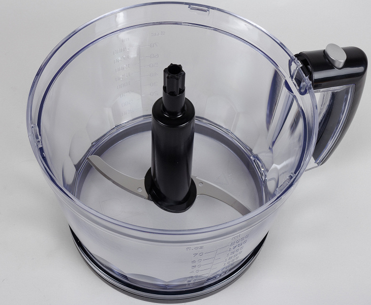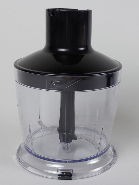 Чаша измельчителя меньше и представляет собой сильно скошенный книзу широкий цилиндр из прозрачного пластика на расширяющемся основании с четырьмя прорезиненными вставками по окружности. На стены чаши нанесена с двух сторон шкала в миллилитрах: от 100 до 500.