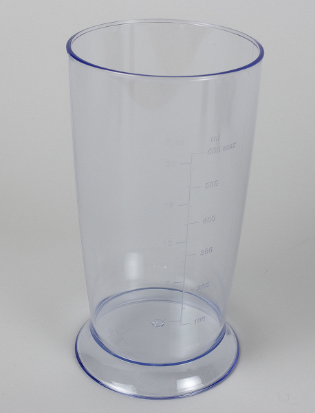 Для работы с погружным блендером и венчиком в комплект входит стакан для измельчения из прозрачного пластика с синеватым отливом. У него устойчивое за счет расширения книзу дно без каких-либо противоскользящих вставок, а на стенку нанесена мерная шкала от 100 до 600 мл.