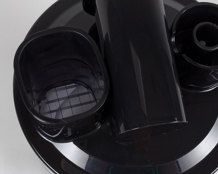 Малая чаша и большая различаются как по форме, так и по размеру. Крышка большой чаши из черного пластика снабжена двумя выступами — сквозной трубой для подачи продуктов и гнездом для подключения моторного блока. Труба для подачи продуктов в сечении является прямоугольником с сильно скругленными углами. Крышка толстая и массивная, изнутри на ней выдавлен знак перечеркнутого крана: ее нельзя мыть под струей воды.