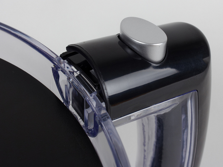 Крышка чаши сделана из черного пластика и имеет выступ — гнездо для присоединения моторного блока. На внутренней боковой кромке крышки есть выступы, которые надо совместить с пазами на чаше и довернуть по часовой стрелке до щелчка.