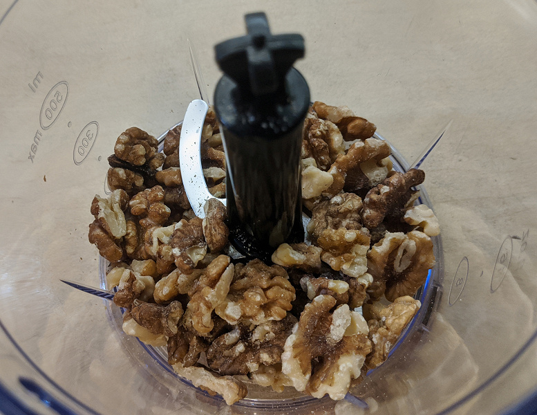 Мы взяли сто граммов грецких орехов, положили их в малую чашу блендера и выставили на моторном блоке пятую скорость. После нажатия кнопки обычного режима через 15 секунд (примерно три из которых были лишними) орехи превратились в мелкую крупку — как раз такую, какую можно класть в соус для сациви или в выпечку.