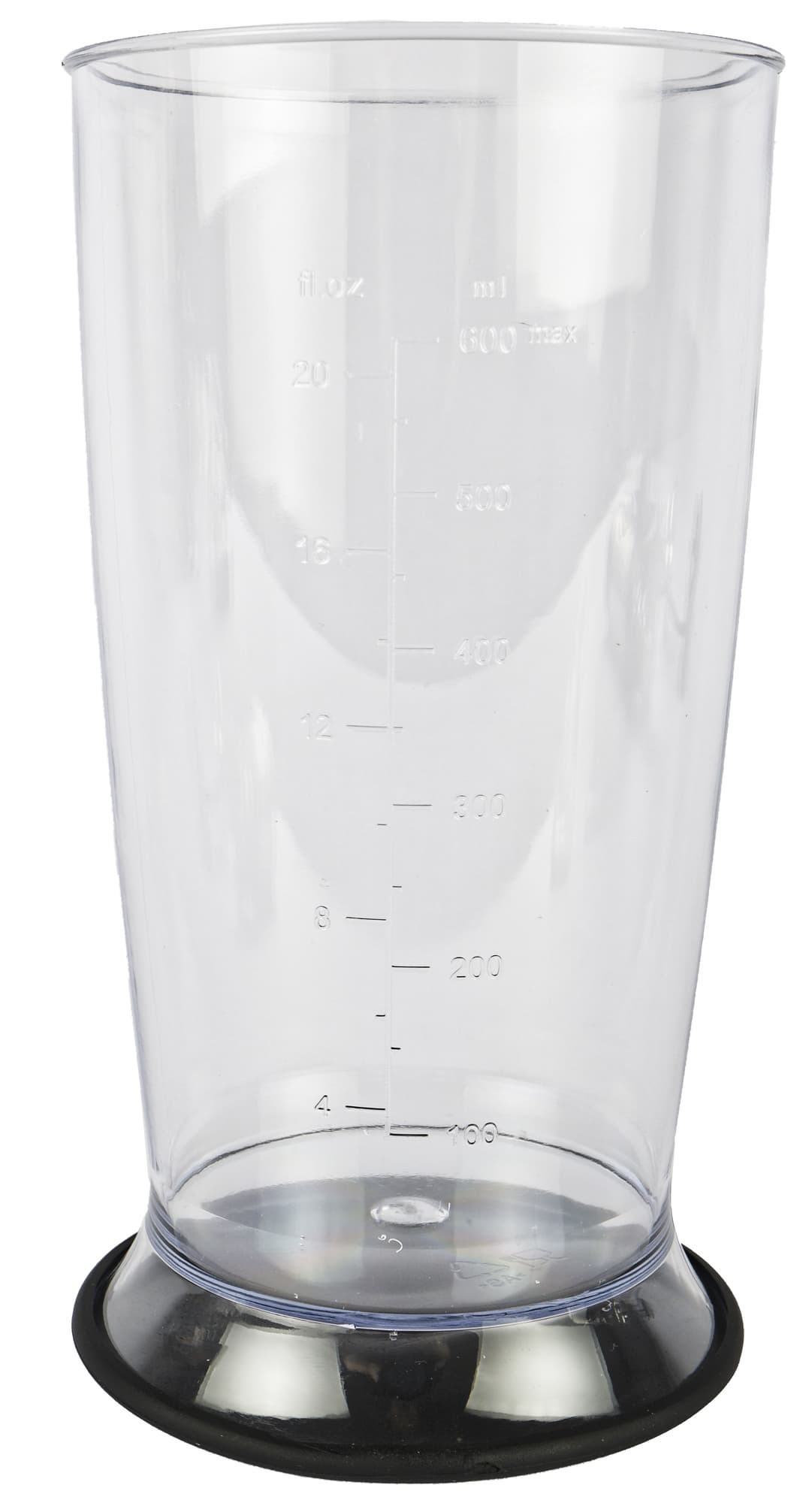 Мерный стакан из прозрачного пластика можно использовать как емкость для блендирования или взбивания. Объем стакана составляет 600 мл, на боку имеется градуировка от 100 до 600 мл с шагом в 50 мл.