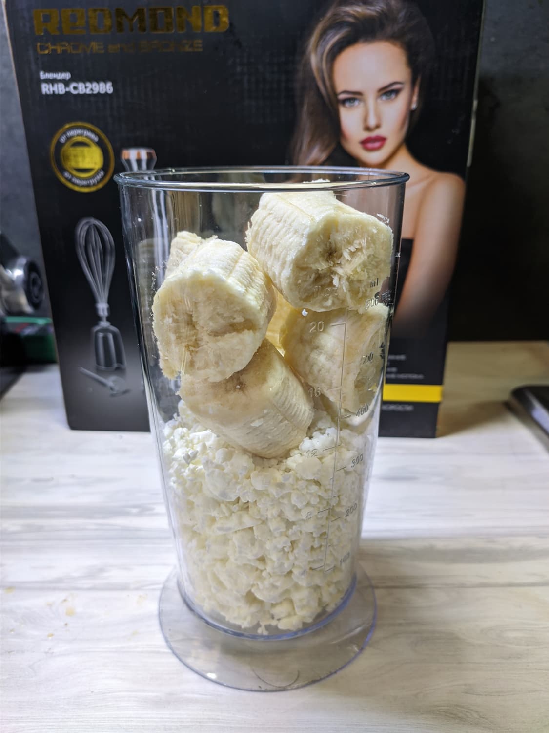 Еще один тест стандартной насадки — измельчение зернистого творога с бананом и небольшим объемом сока.