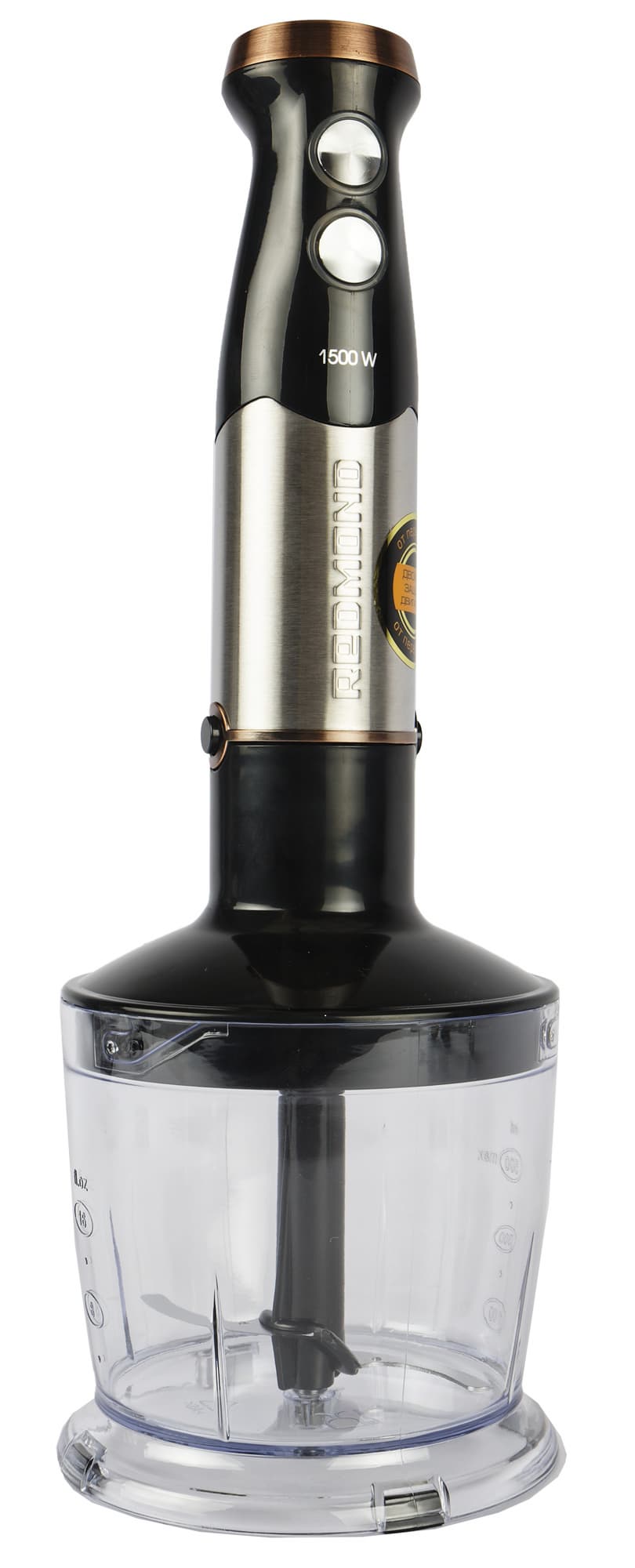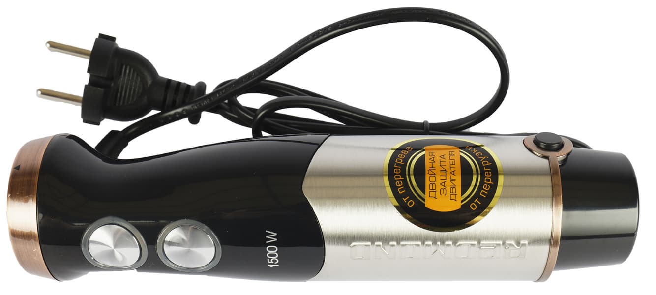 Корпус моторного блока устройства выполнен из черного глянцевого пластика. Нижняя половина закрыта листом из нержавеющей стали с логотипом Redmond. Несмотря на то, что пластик глянцевый, выглядит он не слишком блестящим, а значит, и отпечатки пальцев собирает не слишком сильно.