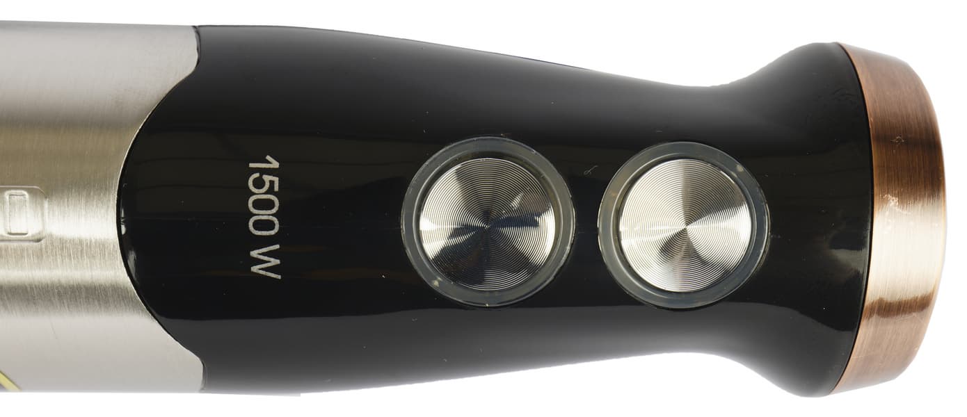 Заявленная мощность прибора составляет от 100 Вт (номинальная мощность) до 1500 Вт (максимальная мощность), что довольно много для ручных погружных блендеров. А значит, мы можем рассчитывать, что прибор справится даже со сложными тестами и не самыми простыми продуктами.