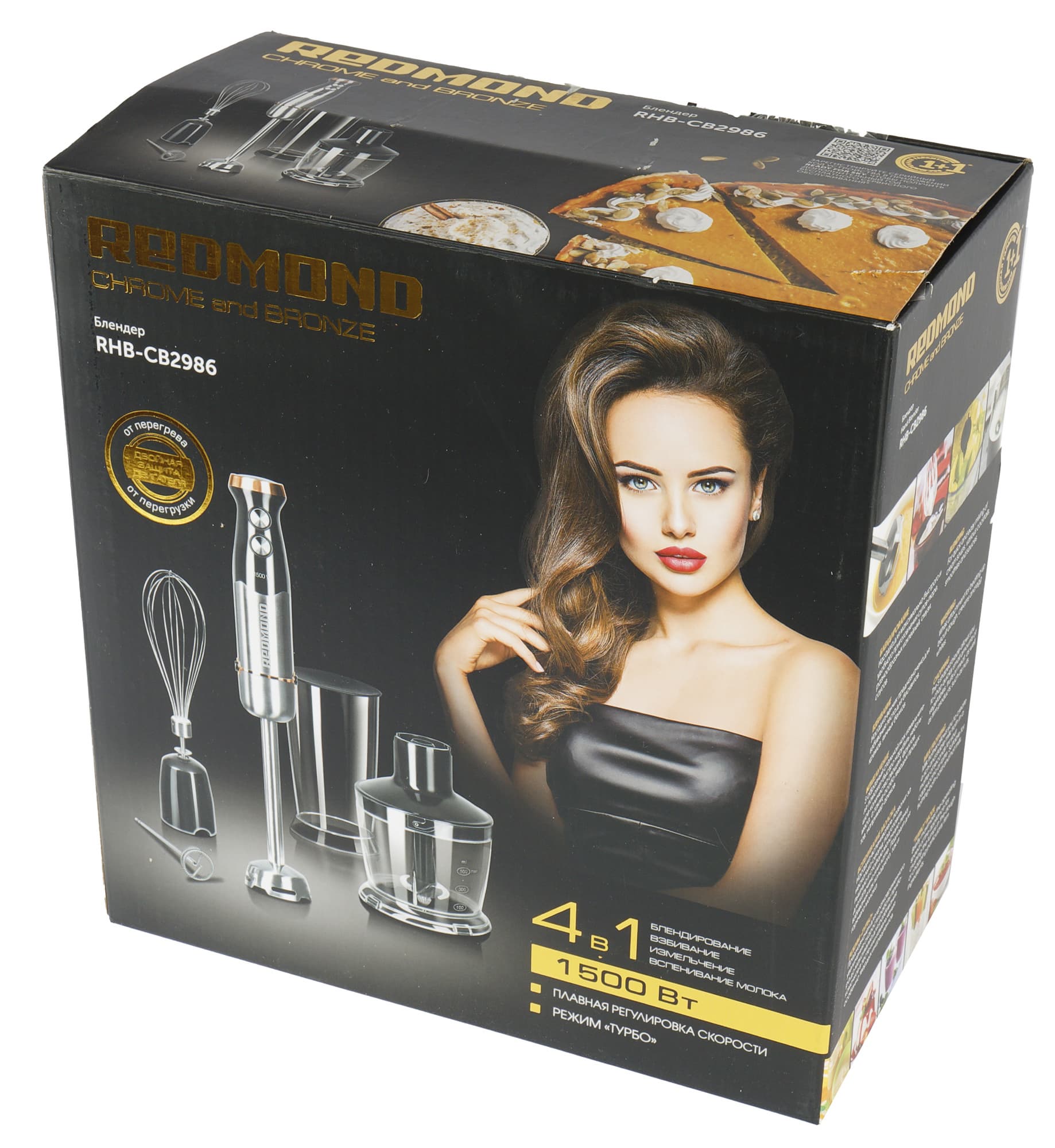 Сама коробка оформлена в фирменном стиле Redmond: на лицевой стороне мы видим красочные фотографии блендера, а также прилагаемых аксессуаров. Тут же — традиционная фотография человеческого лица (видимо, чтобы привлечь внимание к коробке на полках магазинов).