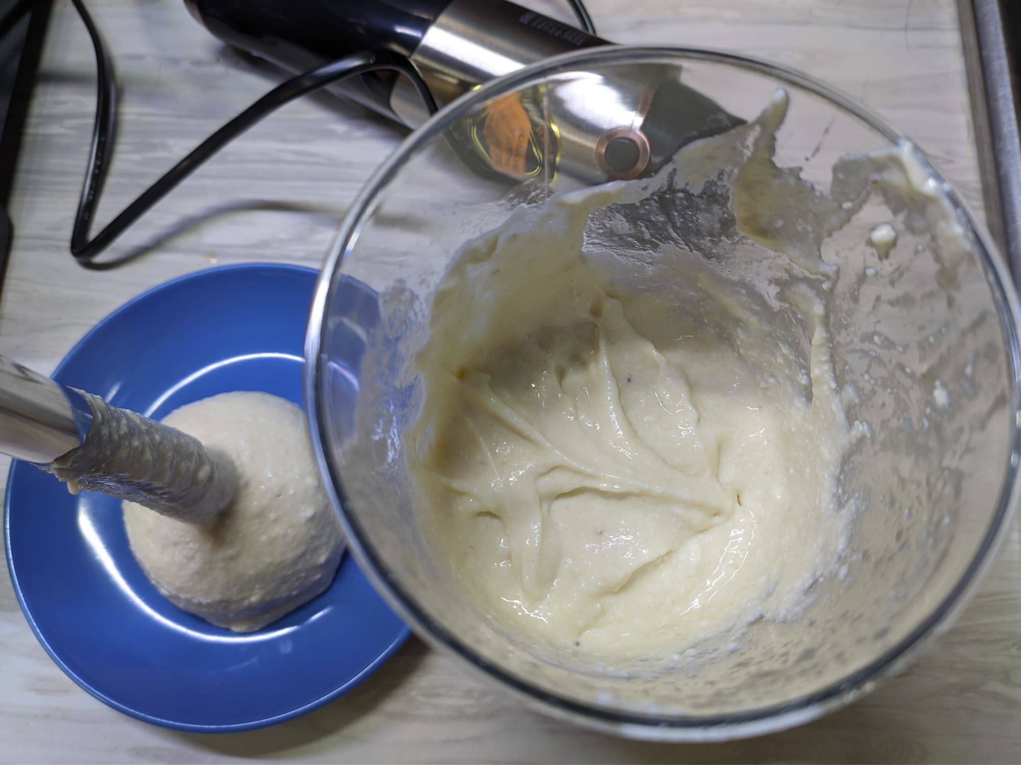 Мы поместили всё в небольшой сотейник и начали перемешивать венчиком на минимальной скорости. Увы, но даже минимальная скорость оказалась довольно высокой: при первом же запуске мы забрызгали всё вокруг.