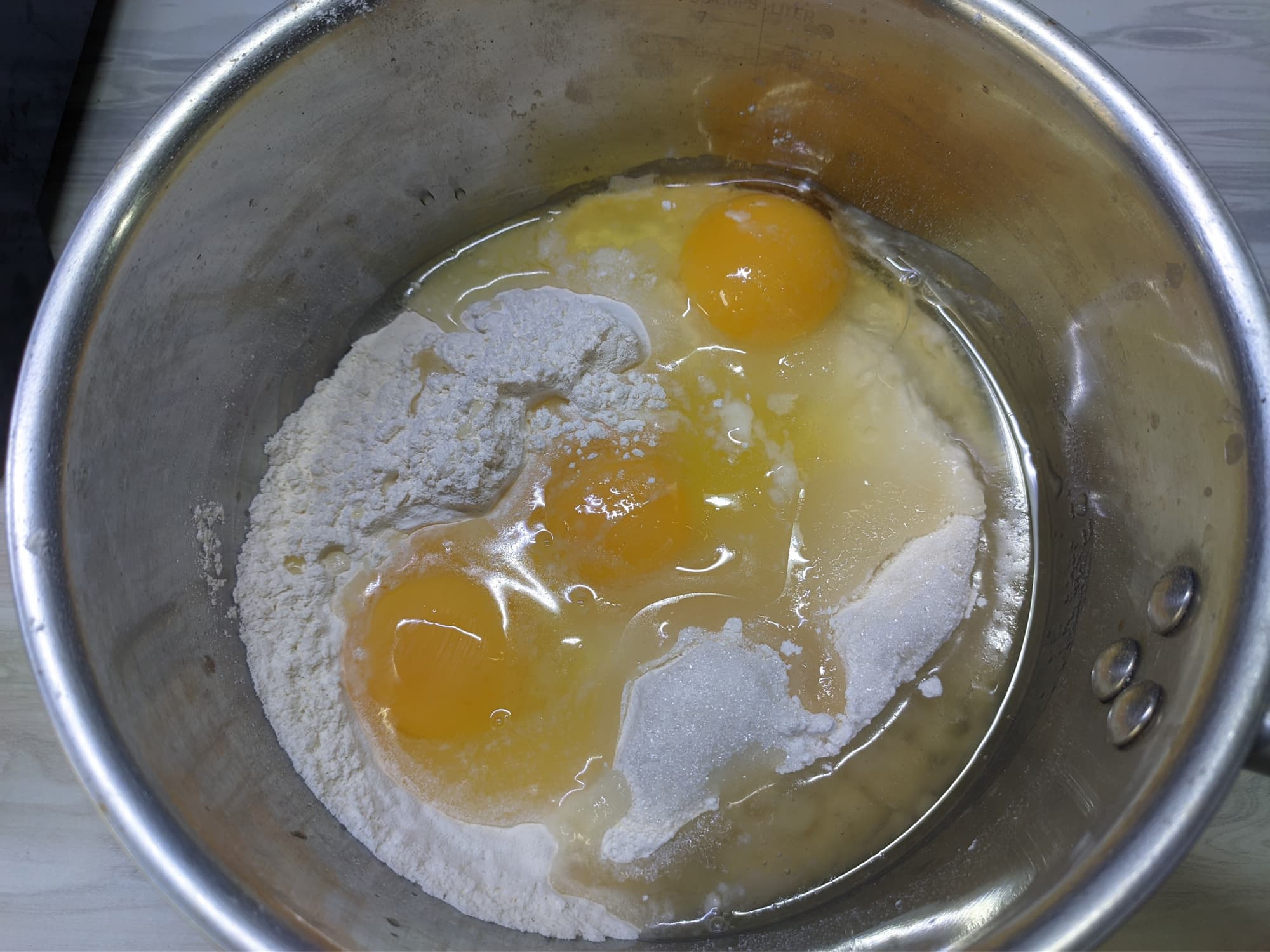Перейдем к тестированию венчика. Пробуем приготовить блинное тесто из стандартного набора ингредиентов — мука, яйца, молоко, соль, сахар.