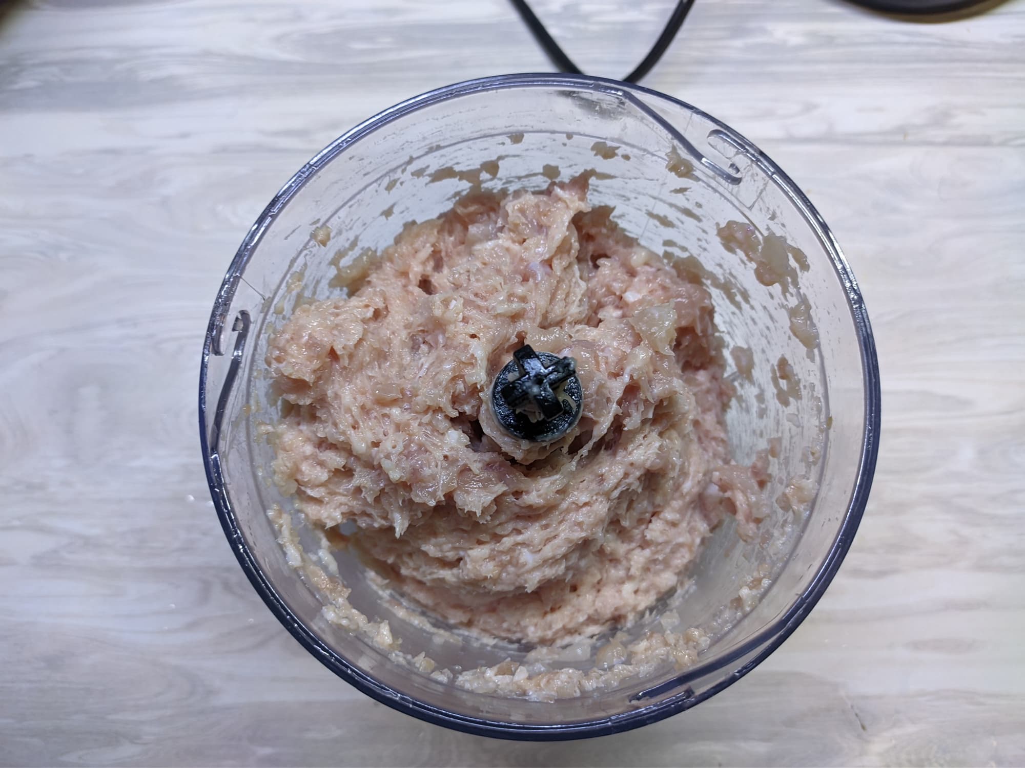 Затем в чашу отправилась курица, также нарезанная на кусочки. Сначала мы перестарались и положили слишком много мяса: верхние кусочки никак не хотели попадать под нож.