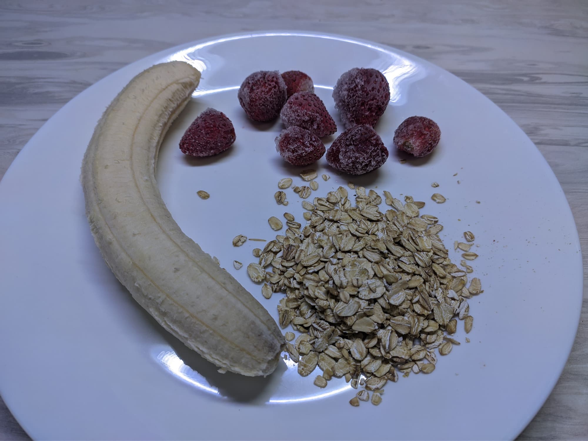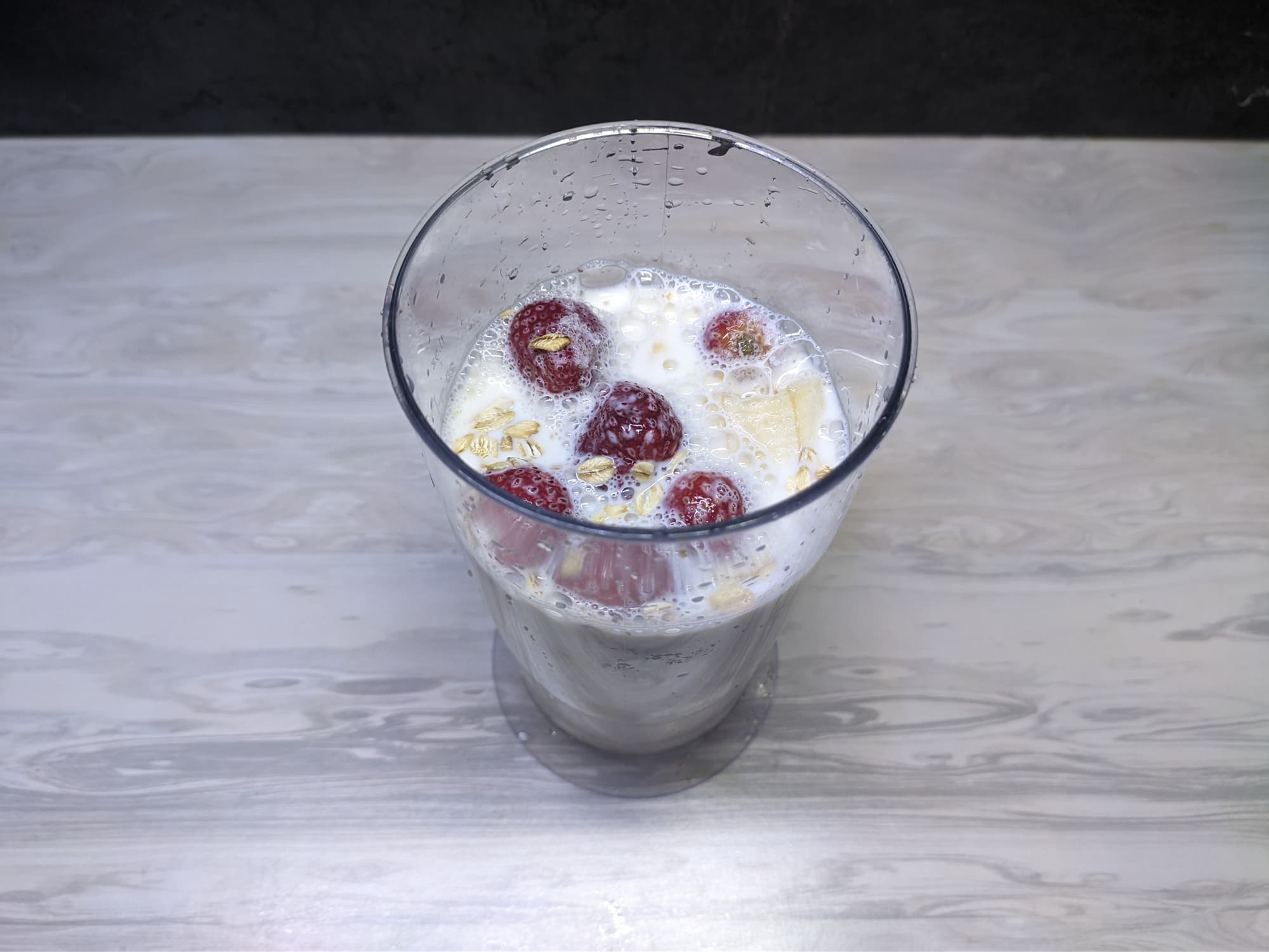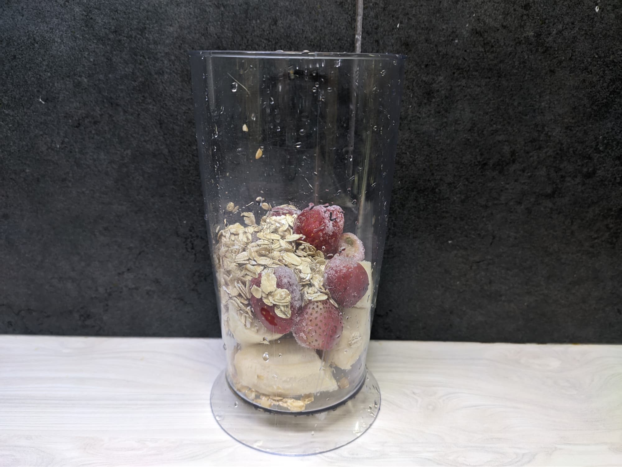 Для следующего теста мы выбрали набор ингредиентов, который проверит возможности блендера со всех сторон: молоко, мягкий банан, замороженные ягоды и сухие овсяные хлопья покажут, насколько хорошо прибор справится с замороженными, вязкими и сухими продуктами.
