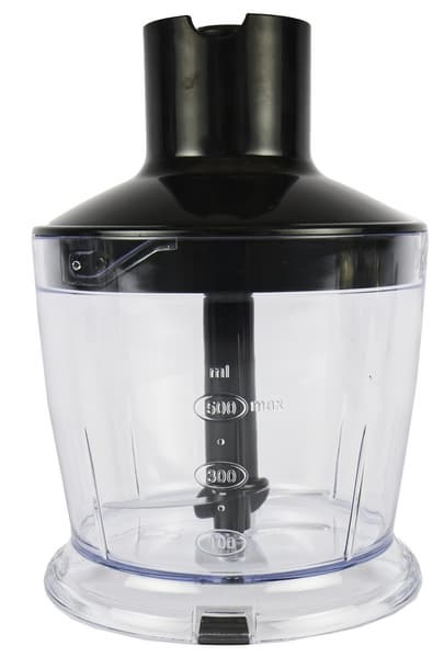 Чаша для измельчения также выглядит стандартно. Она выполнена в виде стакана с широким горлышком и пластиковой крышкой, с помощью которой осуществляется стыковка чаши с моторным блоком. Сама чаша сделана из прозрачного пластика, на котором отмечен максимальный допустимый уровень заполнения чаши продуктами, а также имеется градуировка от 100 до 500 мл с шагом в 100 мл. На дне у чаши есть резиновые ножки-вставки, препятствующие скольжению.