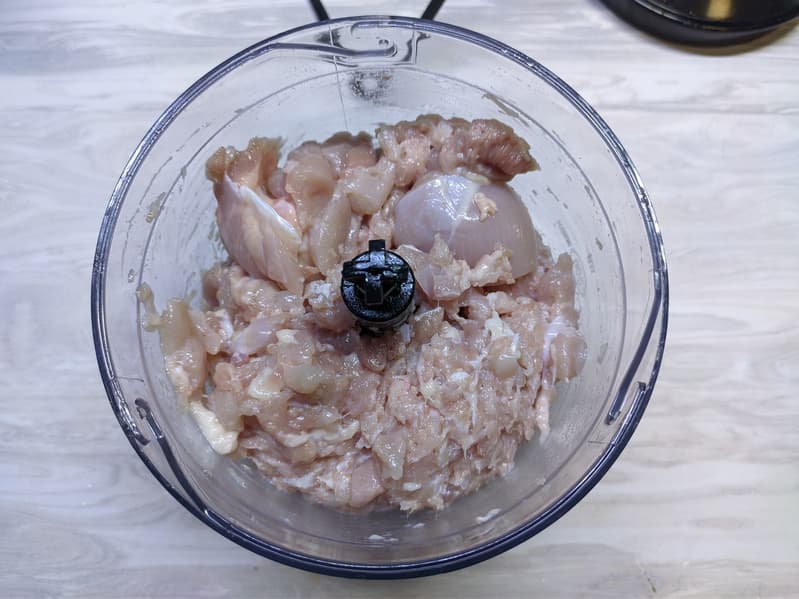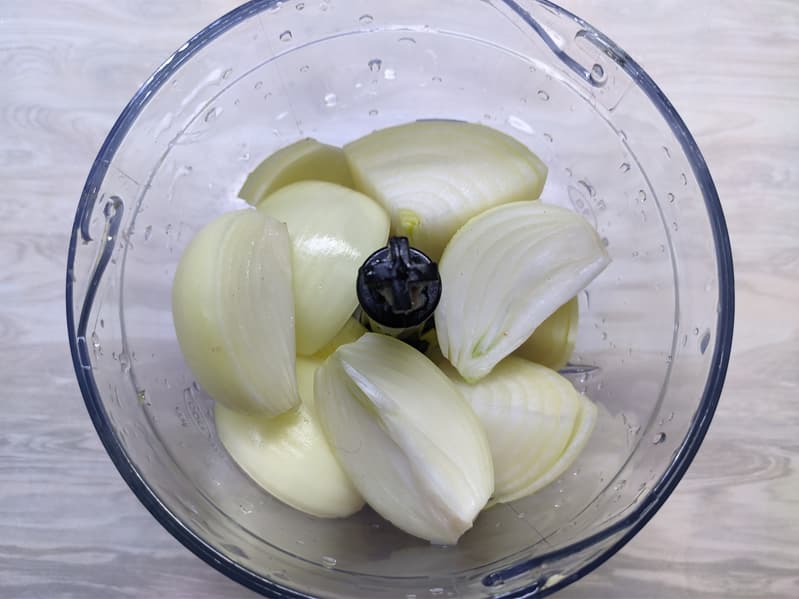 Наконец, разберемся с чашей для измельчения. Приготовим котлетки из курицы. Для этого последовательно измельчим в чаше лук.