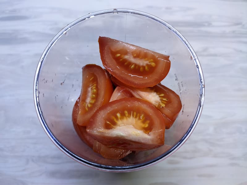Для нашего обязательного томатного теста мы взяли помидоры, разрезали их на кусочки подходящего размера и заполнили стакан блендера.