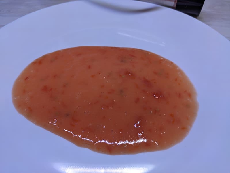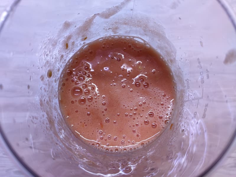 Мы продолжили измельчение еще в течение 30 секунд, после чего получили более-менее однородную воздушную томатную смесь с отчетливыми частицами кожуры и небольшим количеством целых семечек.