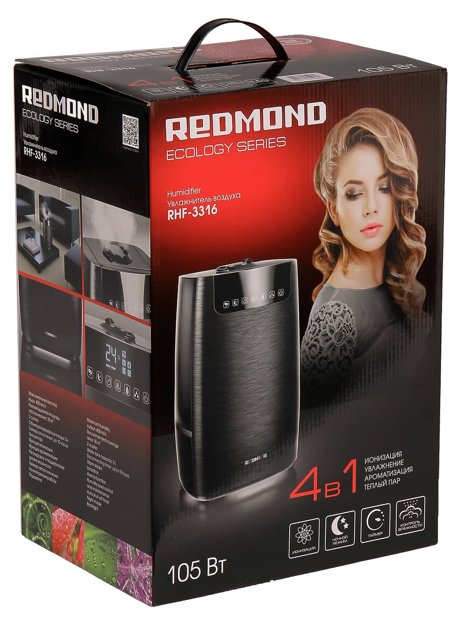 Redmond не изменяет своему стилю оформления, поэтому на картонной коробке мы снова видим миловидную девушку, крупное изображение прибора, ключевые характеристики и загадочные розовые листья с капельками влаги. Учитывая небольшой вес самого увлажнителя, коробка легкая и прекрасно переносится за пластиковую ручку. Защитная упаковка включает полиэтилен и картонные вставки.