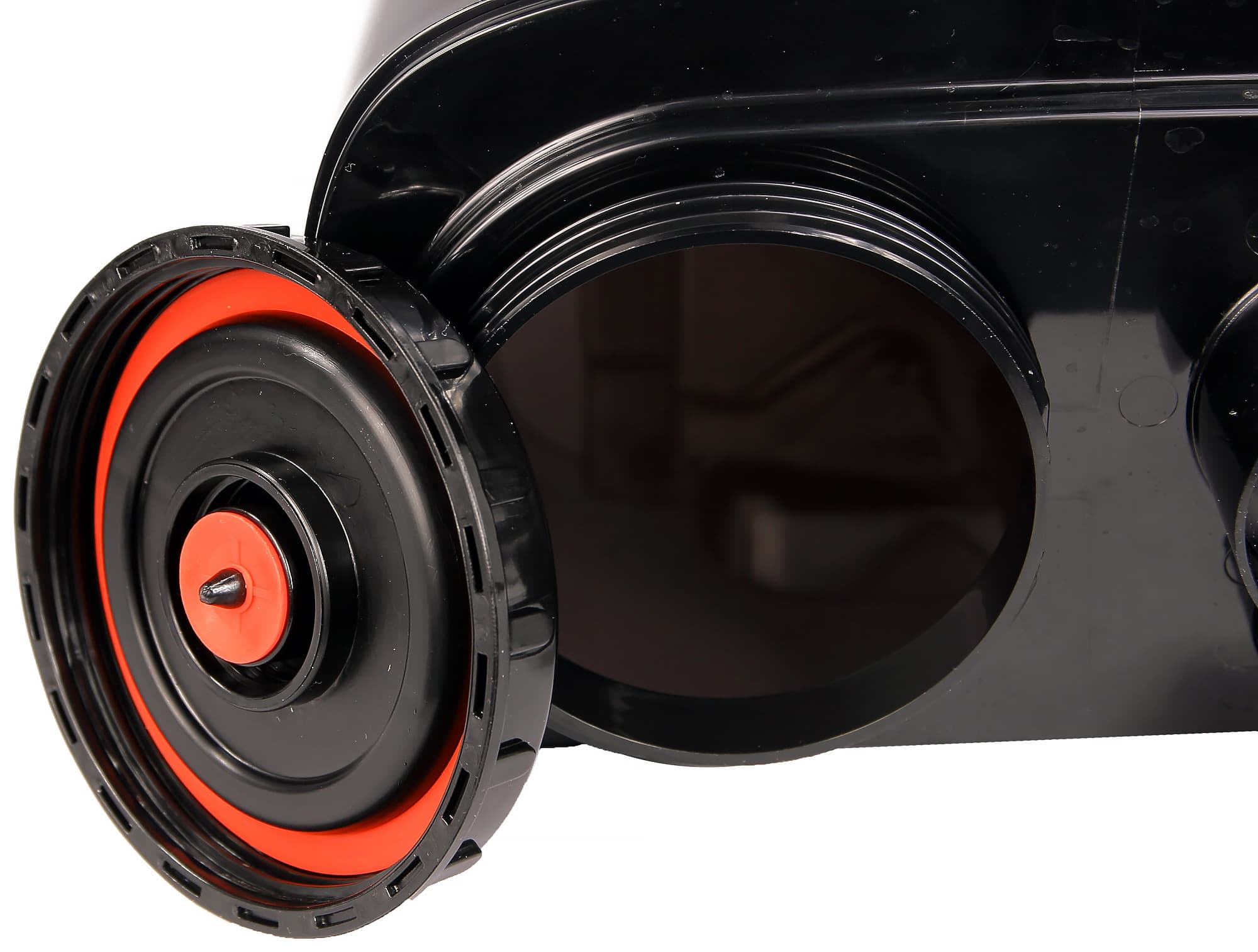 Задняя сторона целиком черная, стык между базой и резервуаром ровный и малозаметный, прорези для забора воздуха тоже не привлекают внимания.