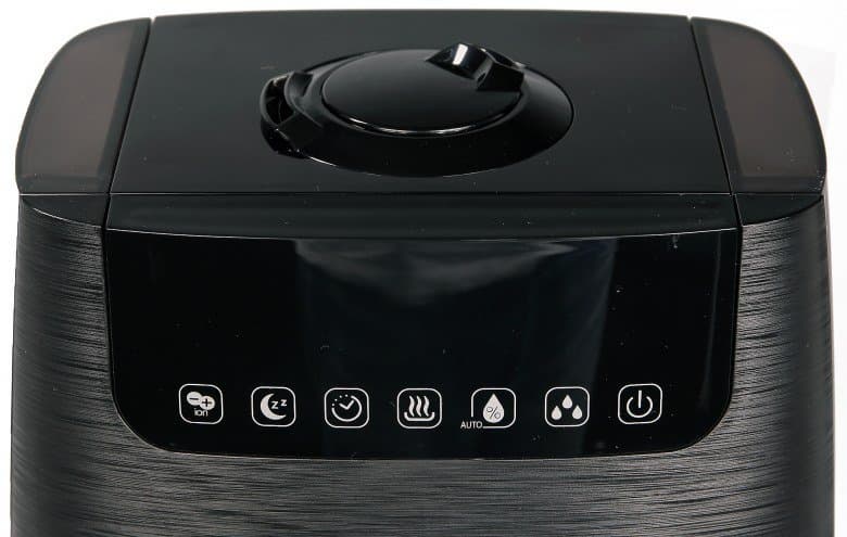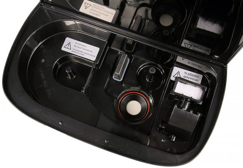 Крупный резервуар на 5 литров выглядит аккуратно и позволяет наливать воду не чаще раза в сутки. Он легко снимается с корпуса и ставится обратно, и в процессе работы никак не фиксируется, поэтому при наличии в помещении детей и животных следует оградить прибор от исследований и падений. Можно придраться к его слабой прозрачности вкупе с отсутствием подсветки в этой зоне — с другой стороны, если залить сразу 5 литров, то можно расслабиться и положиться на автоматический датчик уровня воды.
