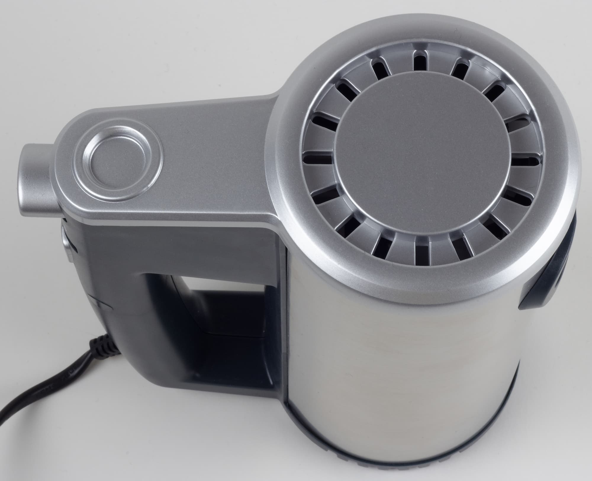 Сам миксер весьма симпатичен: металлический корпус его основной части выполнен в виде правильного цилиндра с вентиляционной накладкой из серебристого пластика сверху и накладкой из черного пластика снизу. Последняя предназначена для того, чтобы миксер на ней стоял, и она действительно обеспечивает прибору устойчивость даже с подключенными насадками.
