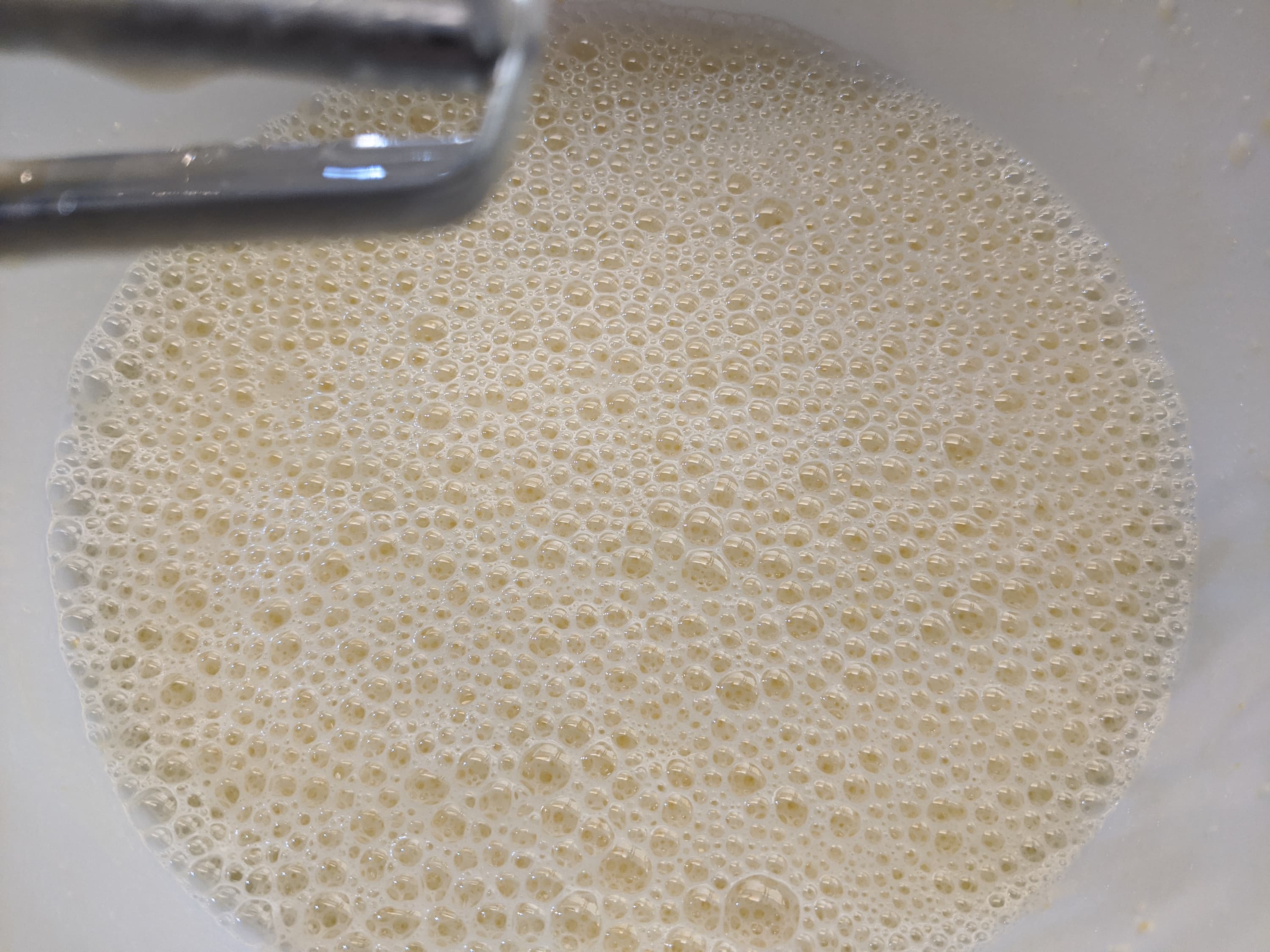 Взбили 150 граммов сахара, два яйца и 50 граммов муки (а еще щепотку соли и ванилина на кончике ножа) в крепкую пену с помощью насадок для взбивания. Затем добавили пол-литра молока и взбивали дальше — до полного растворения сахара.