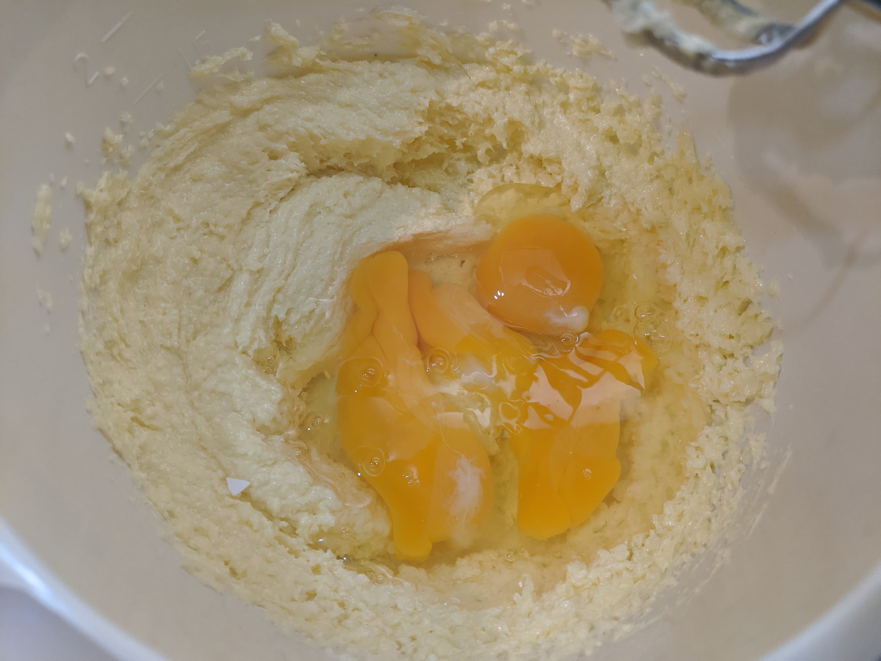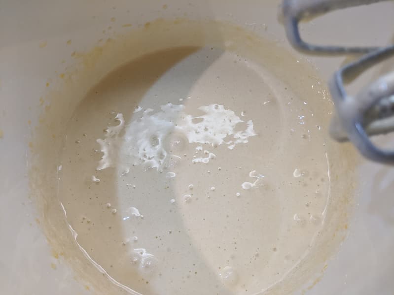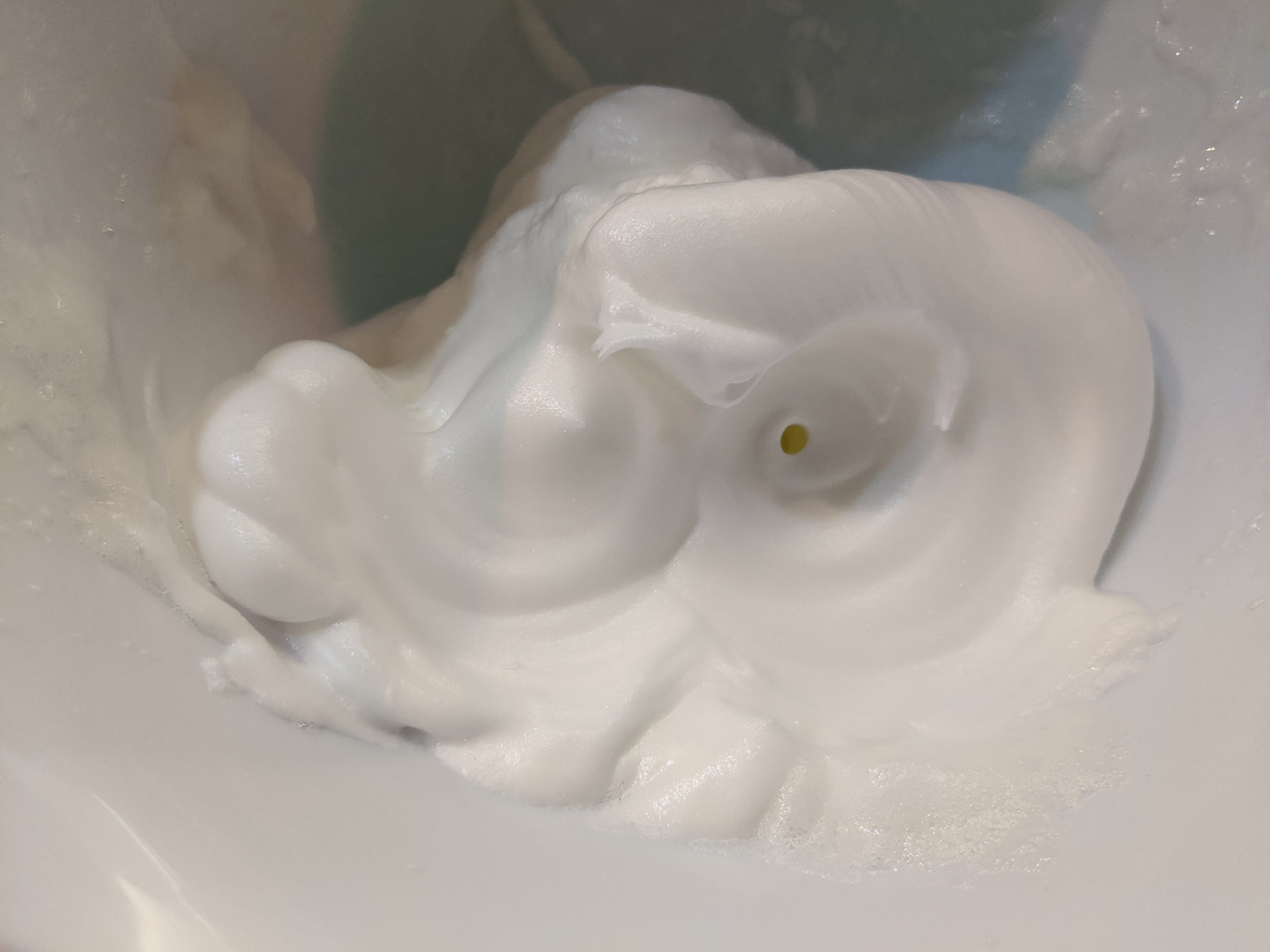 Добавили три яйца и щепотку соли и взбили до полного растворения сахара — теперь уже на пятой скорости (самой высокой). Этот этап продлился 2 минуты 45 секунд, а средняя мощность составила 96 Вт в начале и 81 Вт в конце. Разница понятна: сначала миксеру приходилось выполнять больше работы, создавая из продуктов гомогенную массу.