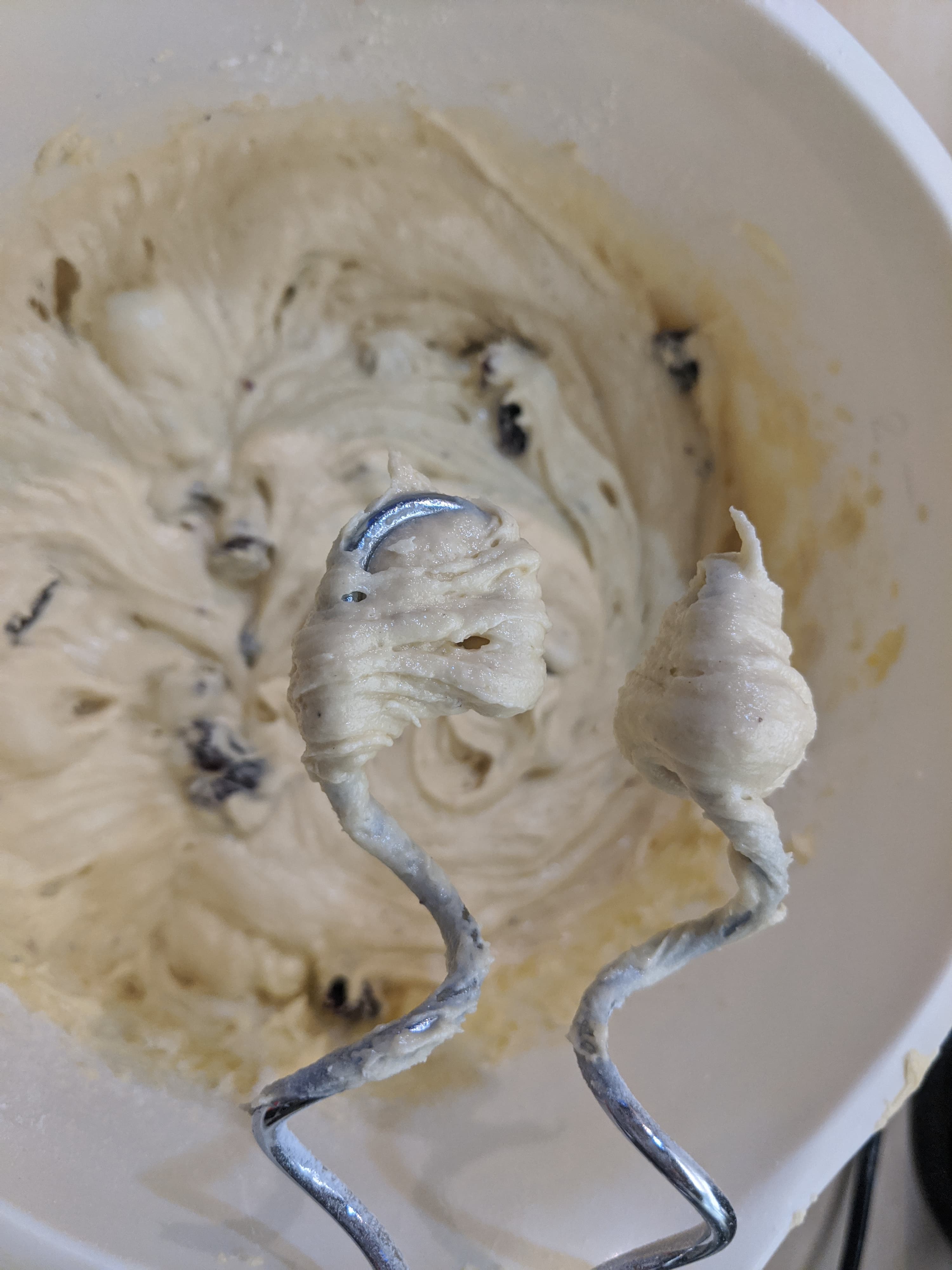 Теперь мы сменили насадки со взбивалок на мешалки и постепенно ввели в полуфабрикат теста муку (250 граммов). Мешалки без напряжения работали как на пятой, так и на третьей скорости. Эта часть заняла у нас 1 минуту 43 секунды, средняя мощность — от 80 до 71,6 Вт.