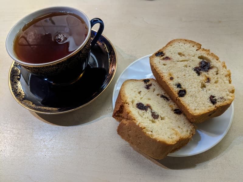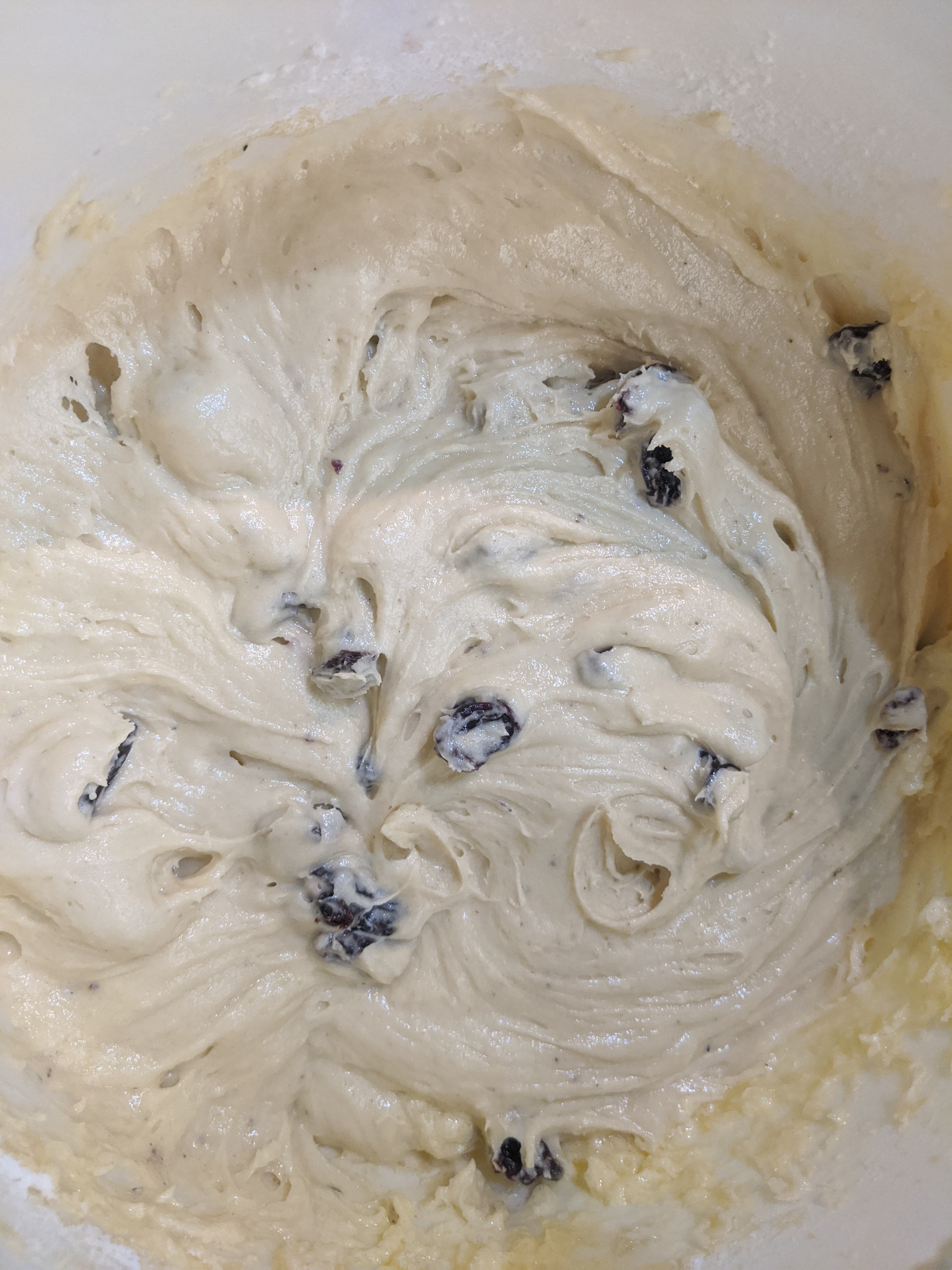 После полного вымешивания мы добавили в тесто изюм и разрыхлитель, быстро размешали миксером в течение секунд 15 и выложили в форму, смазанную маслом. Запекали при температуре 140 °C в течение 1 часа 15 минут.