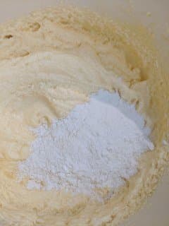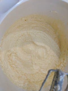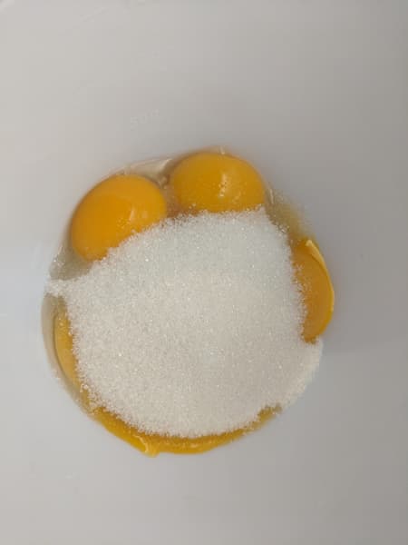 Мы взяли четыре яичных желтка и взбили их со 150 граммами сахара (в рецепте 200 — и можно было бы взять еще меньше). Смесь должна была стать белой и увеличиться в объеме раза в два, а то и в три, а сахар — полностью раствориться. Поэтому взбивать пришлось довольно долго, минуты четыре на максимальной мощности (пятый режим).