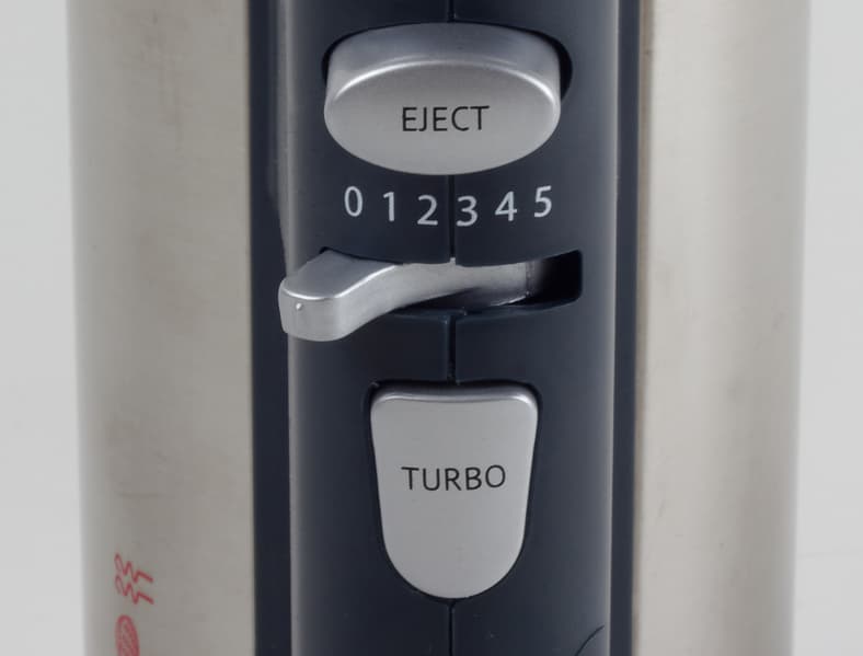 Миксер управляется очень просто — ровно так, как надо для прибора, который все время находится в руках. При включении в сеть надо переключать скорости от 0 до 5 горизонтальным рычажком. Особенностью тестируемой модели стало то, что рычажок очень удобно переключать большим пальцем, причем в обе стороны и невзирая на то, какая рука у повара рабочая. Скорости переключаются плавно, но четко фиксируются. Переключение сопровождается легким щелчком.