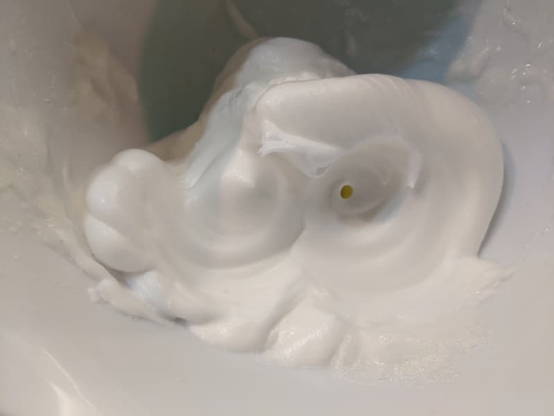 Мы взяли один холодный яичный белок и взбили его в турбо-режиме. За 1 минуту и 42 секунды мы получили пышную стойкую пену. Средняя мощность прибора при этом составила 81,6 Вт.