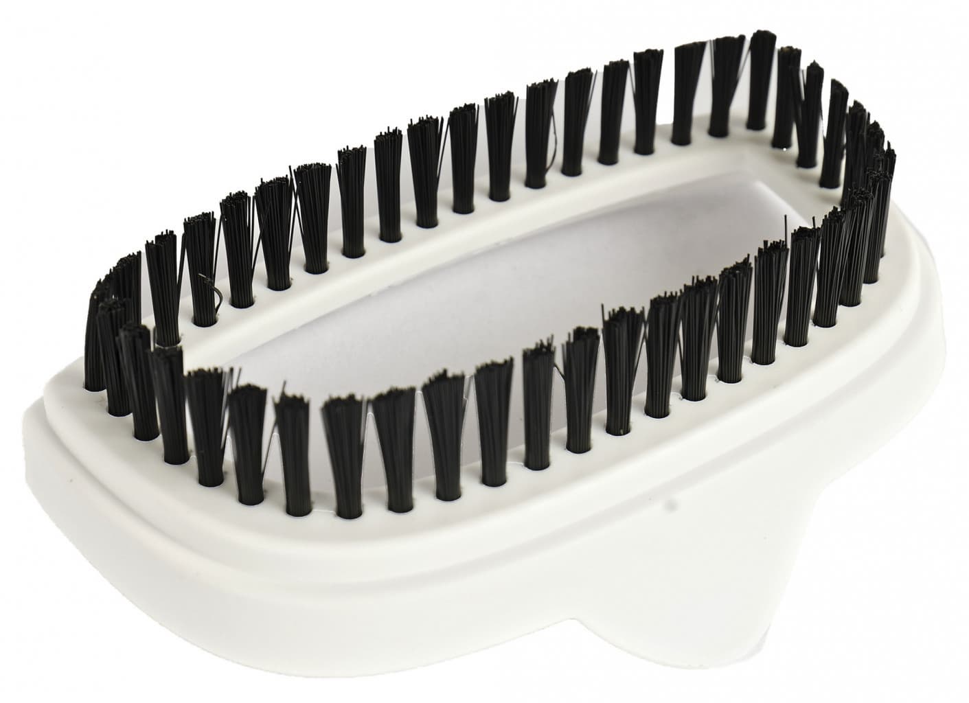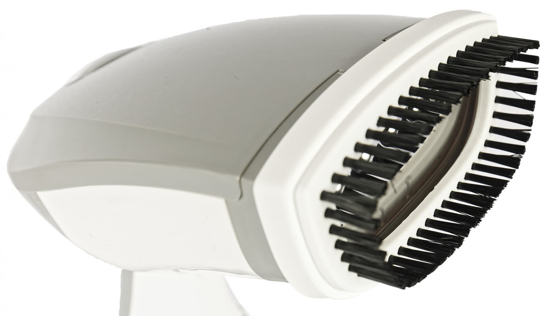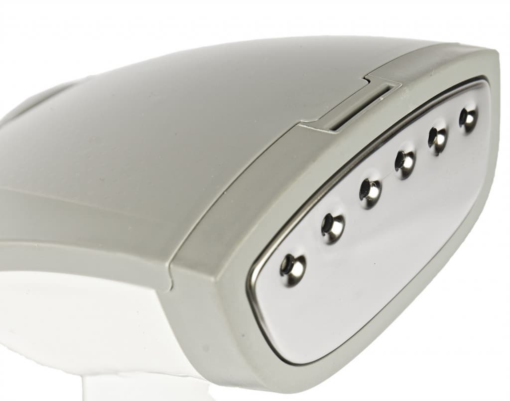 Место для подачи пара с шестью отверстиями выполнено из металлической пластины. Мощная струя милосердна, при случайном прямом попадании на кожу ощущается, но не травмирует. В дополнение есть аксессуар, щетка-насадка из белого пластика с черным ворсом по всему периметру обода. Она интуитивно понятно прикрепляется к прибору.