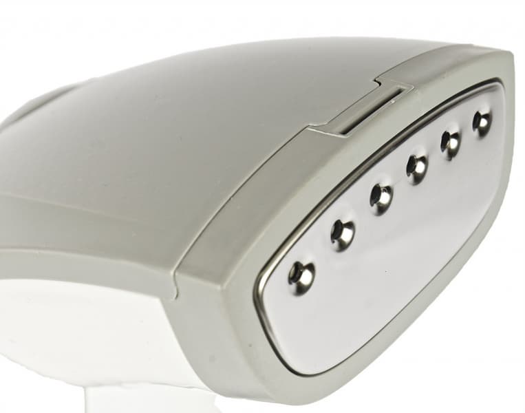 Оформлен прибор сочетанием двух цветов: из белого и серого пластика. В основание встроены прорезиненные ножки для большей устойчивости, чтобы в процессе его было легко поставить — отставить на любую поверхность (стола, пола, стула).