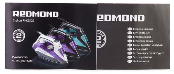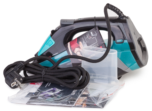 Внутри тары, кроме самого утюга, обнаруживаем мерный стакан на 150 мл, инструкцию и сервисную книжку. Распаковав нашего подопытного, приступаем к визуальному осмотру.