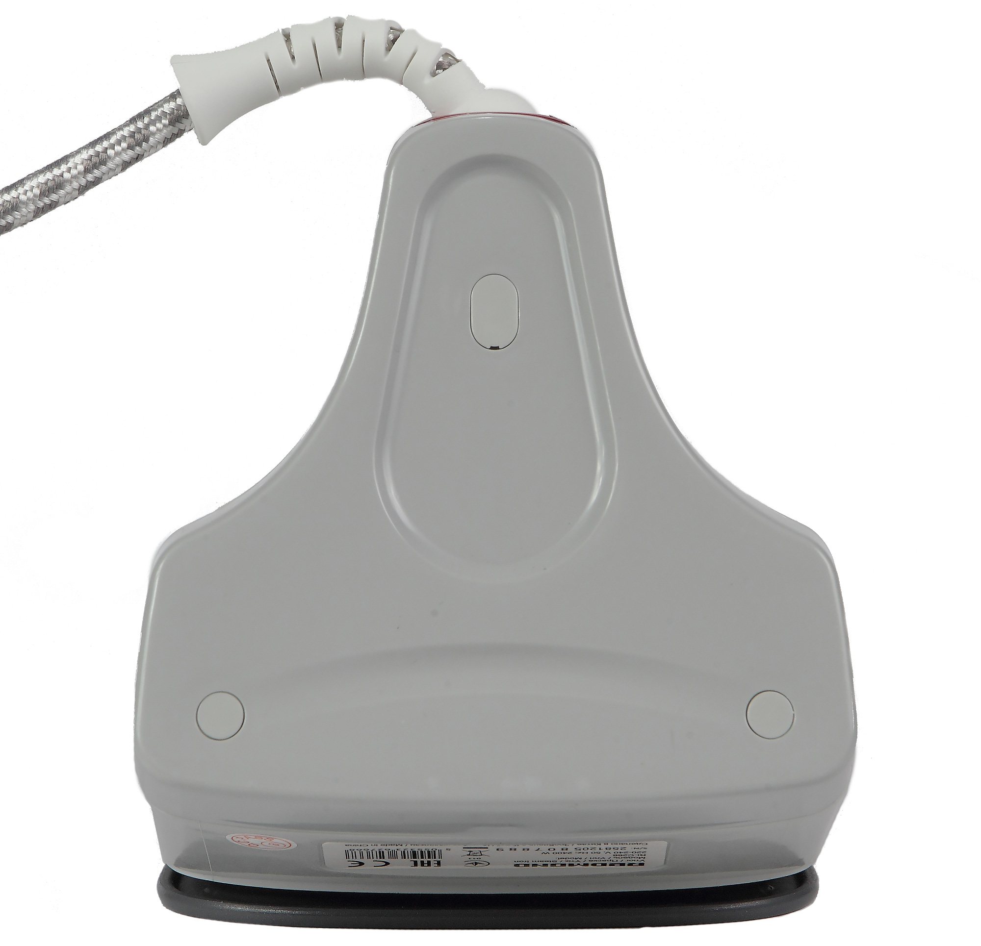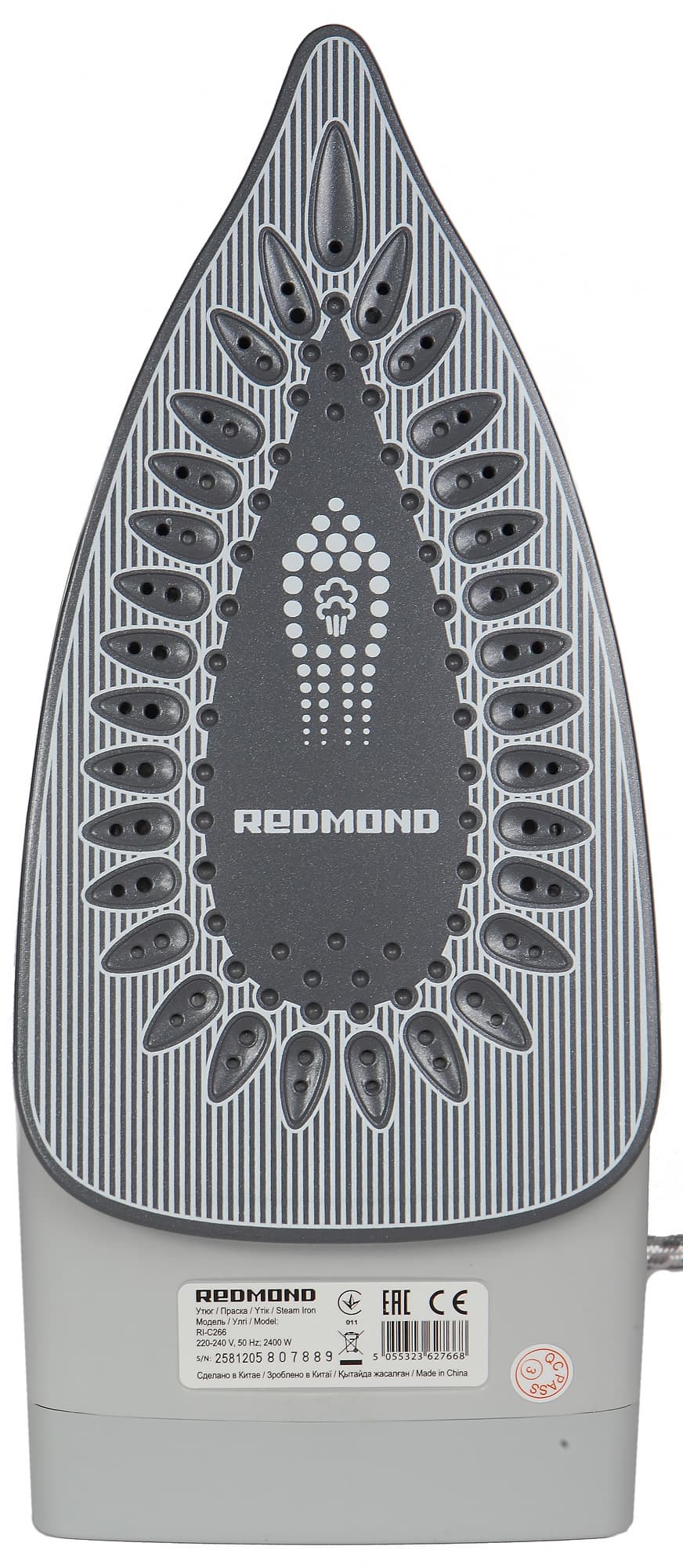 Форма подошвы — стандартная треугольная со скругленными гранями, углами и зауженной вершиной. Подошва утюга имеет керамическое покрытие. Его поверхность гладкая, без зазубрин и царапин. По периметру в два ряда расположены отверстия для выхода пара. Ряды, расположенные ближе к основанию подошвы, не оснащены отверстиями выхода пара и предназначены, видимо, для более равномерного распределения пара по поверхности ткани. Выемки, идущие вдоль центральной каплевидной части подошвы, также не имеют отверстий. На подошву нанесены геометрические узоры и тонкие линии.