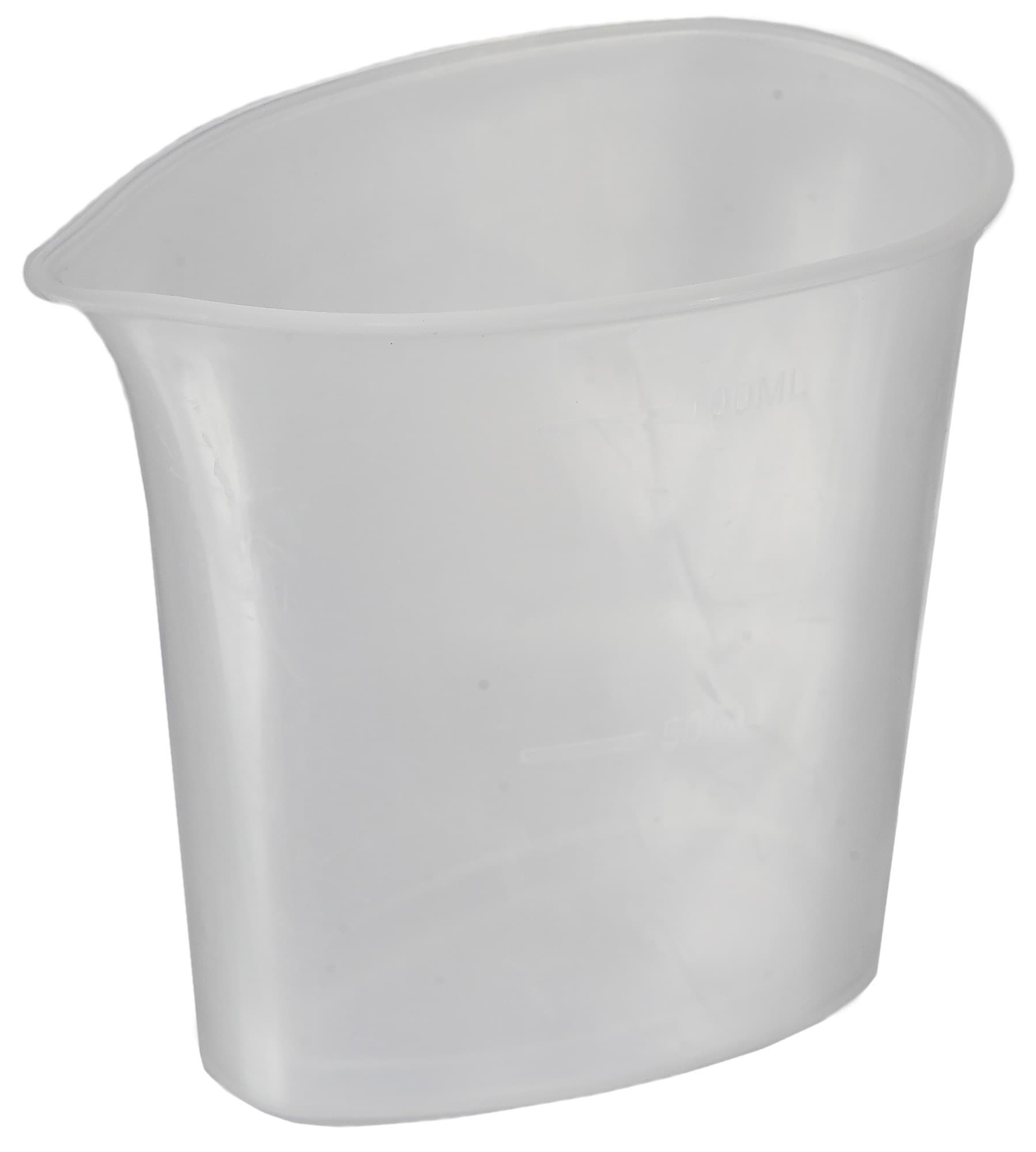 В комплект входит пластиковый стаканчик объемом в 100 мл. На стенке стаканчика нанесены отметки объема в 50 и 100 мл. Емкость узкая и оснащена носиком для удобного и безопасного наполнения водой резервуара утюга.