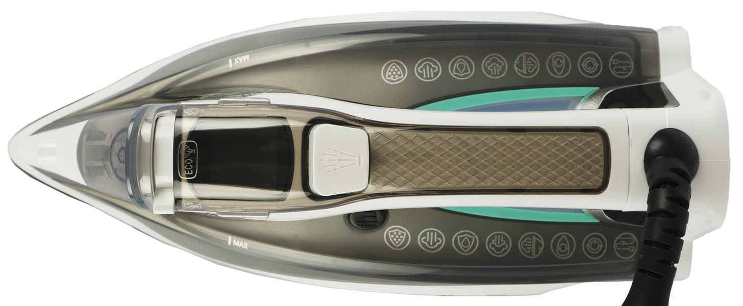 Стенки резервуара для воды прозрачны, что позволит следить за объемом оставшейся жидкости. С обеих сторон утюга, на резервуар нанесены отметки о максимально допустимом уровне наполнения бойлера и иконки с обозначением функций прибора.