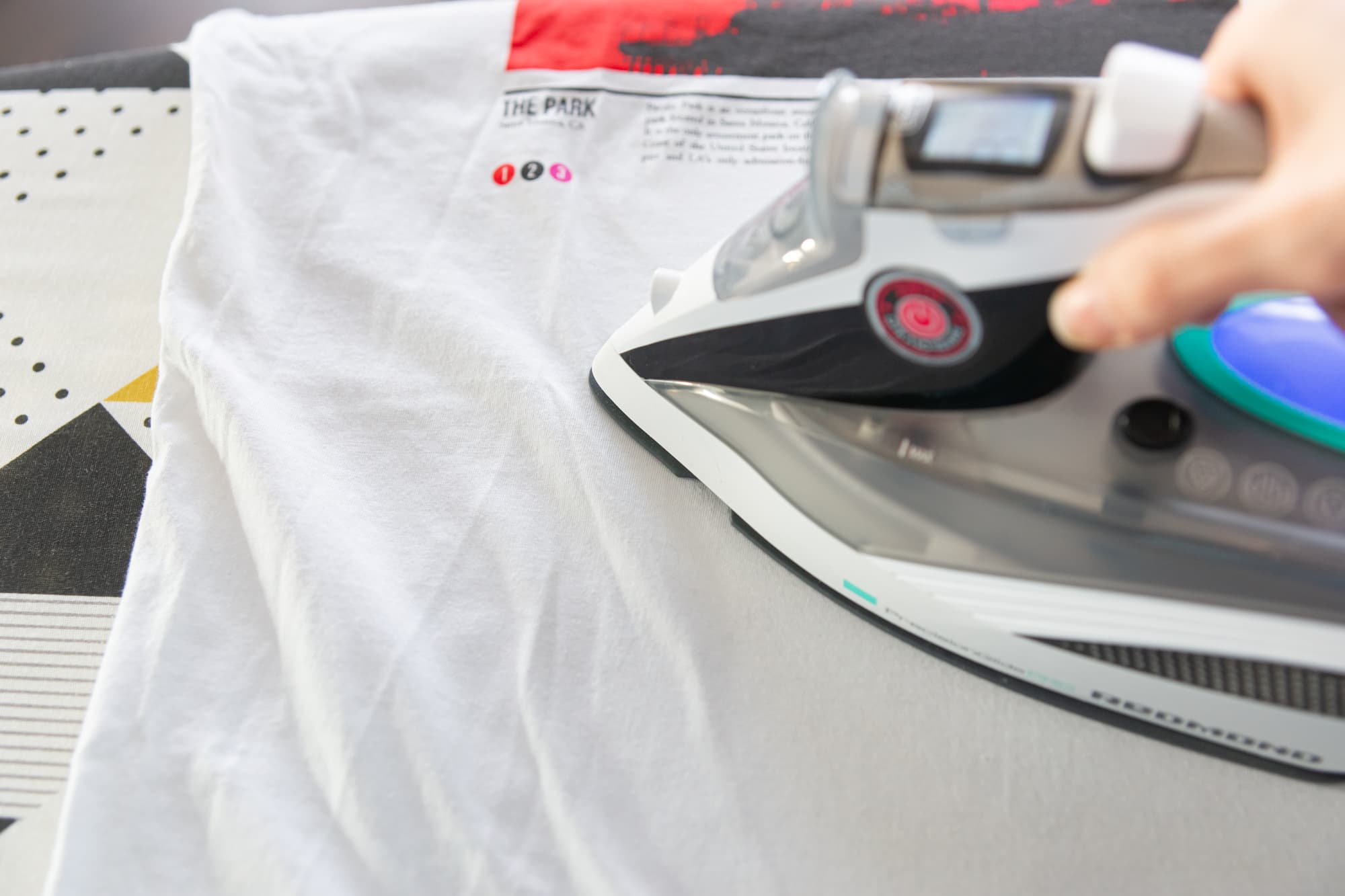 Изделия с принтами не рекомендуется гладить с лицевой стороны, но мы рискнули. Утюг работал на 7-й программе (Blend). Здесь мы ориентировались не на тип ткани, а на температуру нагрева — 148—170 °C.