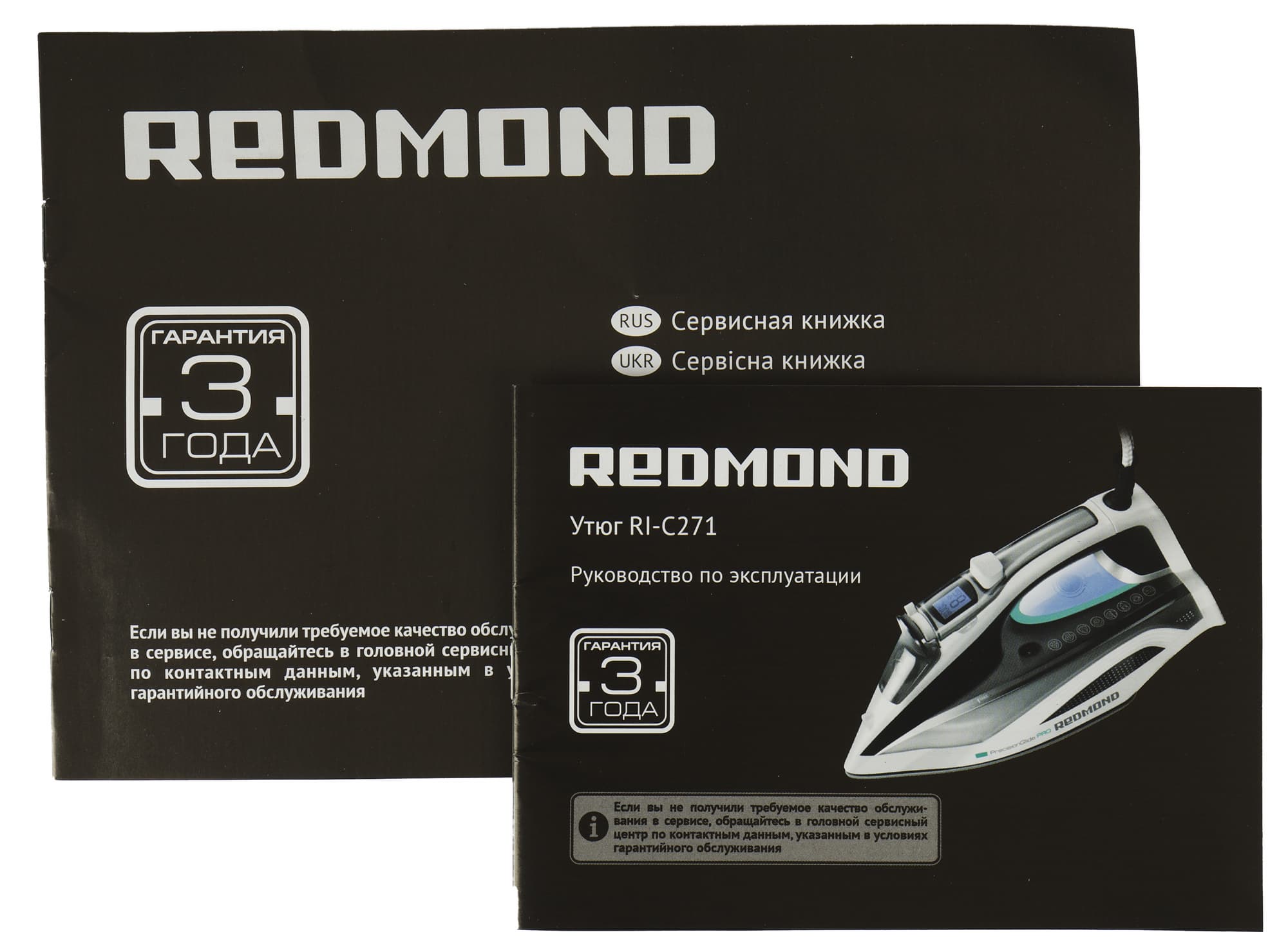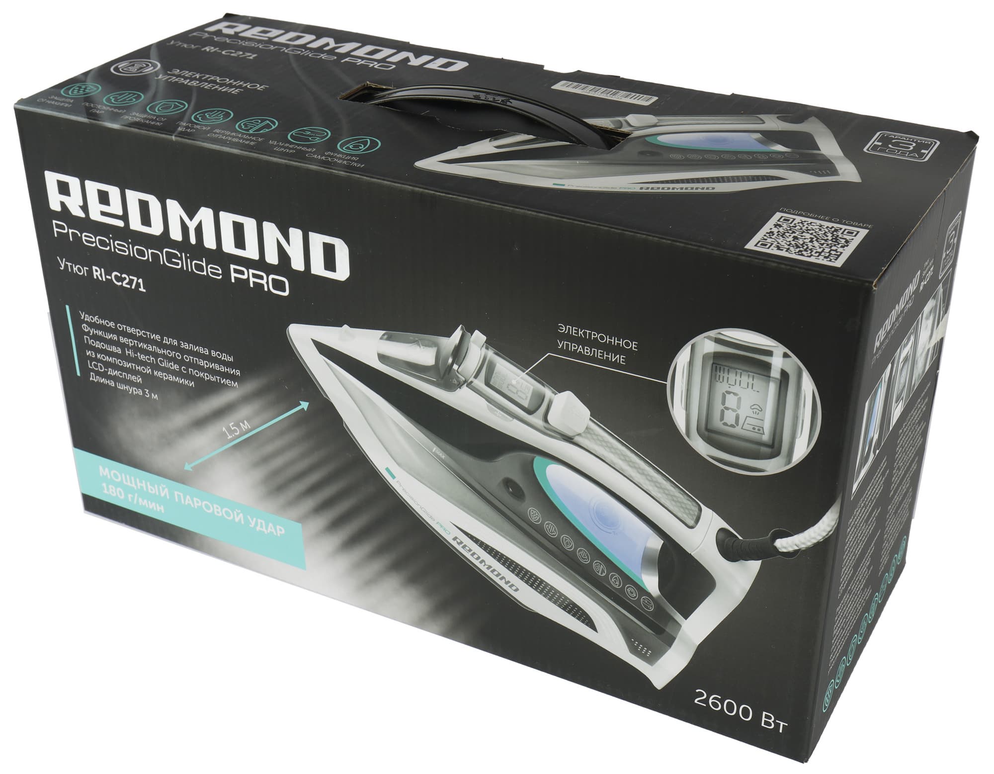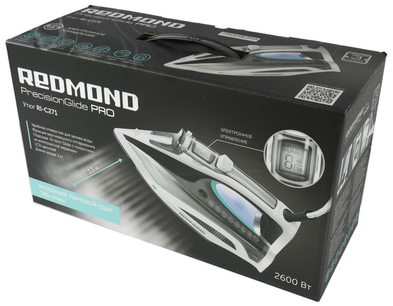 Утюг Redmond RI-C271 упакован в небольшую картонную коробку оформленную в фирменном стиле компании. На черно-сером фоне мы видим выделенный серебристым логотип компании, изображения прибора, краткое описание его преимуществ и технические характеристики. Коробка максимально информативна и дает полное представление как о внешнем облике утюга, так и о его функциональных особенностях.