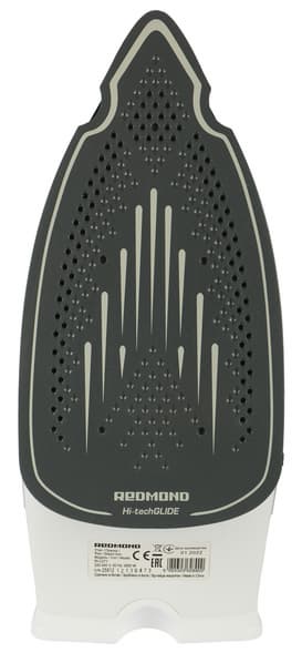 Со стороны подошвы у основания есть наклейка с названием модели, серийным номером и технической информацией. Поверхность керамического покрытия на ощупь гладкая. На ней отштампованы углубления ромбовидной формы. Отверстия для выхода пара расположены дугой на носике двумя рядами по бокам.
