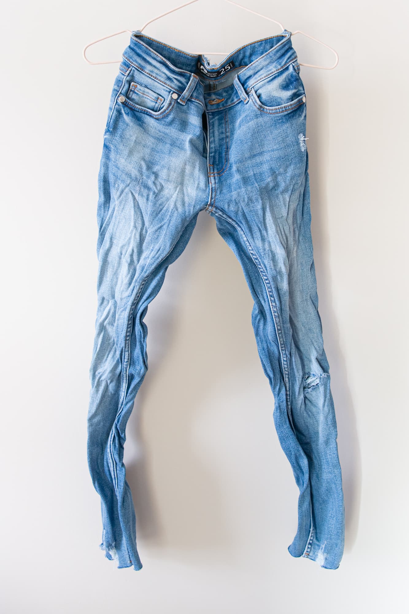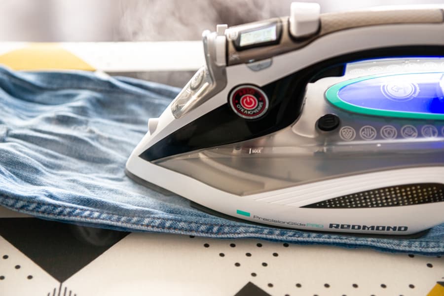 Измятые и пересушенные джинсы из плотной ткани обрабатывались на максимальном 11-м режиме, так как к этому моменту мы уже выяснили, что разницы в программах для хлопка, джинсовой ткани и льна нет.