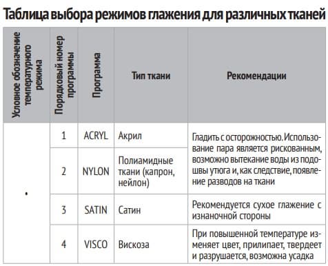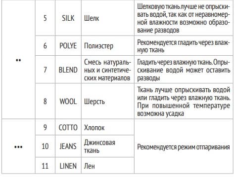 | Номер программы | Условное обозначение | Тип ткани | Температуры подошвы утюга (°C) |