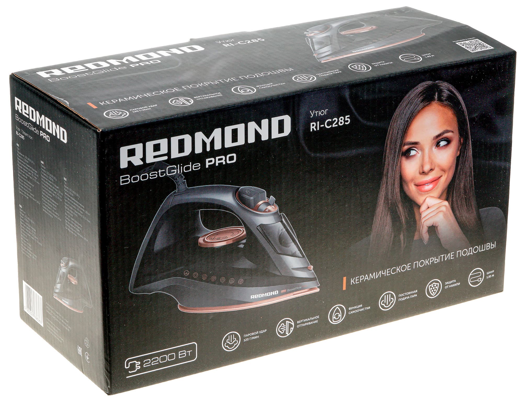 Утюг Redmond RI-C285 попал в наши руки в упаковке узнаваемого «редмондовского» дизайна. На коробке черного цвета можно увидеть фотографию прибора и милой барышни, заинтересованно смотрящей на него, а также ознакомиться с техническими характеристиками и достоинствами утюга. На одной из боковых сторон имеются снимки отдельных частей аппарата и их описание. Текстовая информация представлена на русском и английском языках.