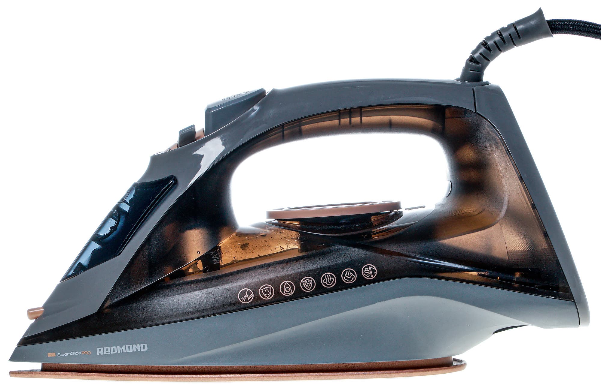 Боковые стенки резервуара для воды непрозрачны, уровень жидкости можно разглядеть через прозрачную панель, на которой размещен регулятор температурных режимов. Здесь же нанесена отметка о максимально допустимом уровне наполнения емкости. С боковых сторон имеются символьные обозначения всех функций и систем, которыми оснащен утюг.