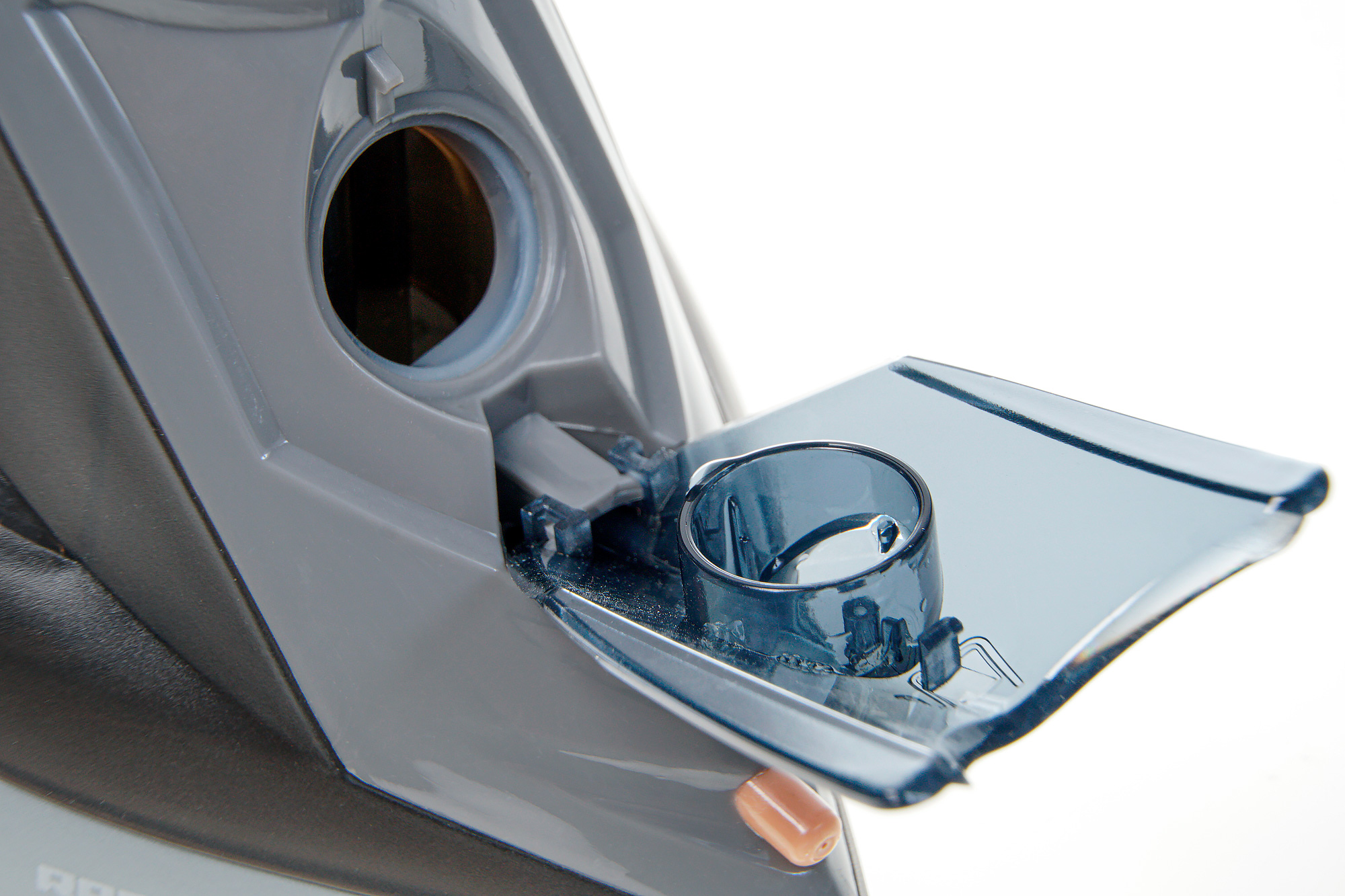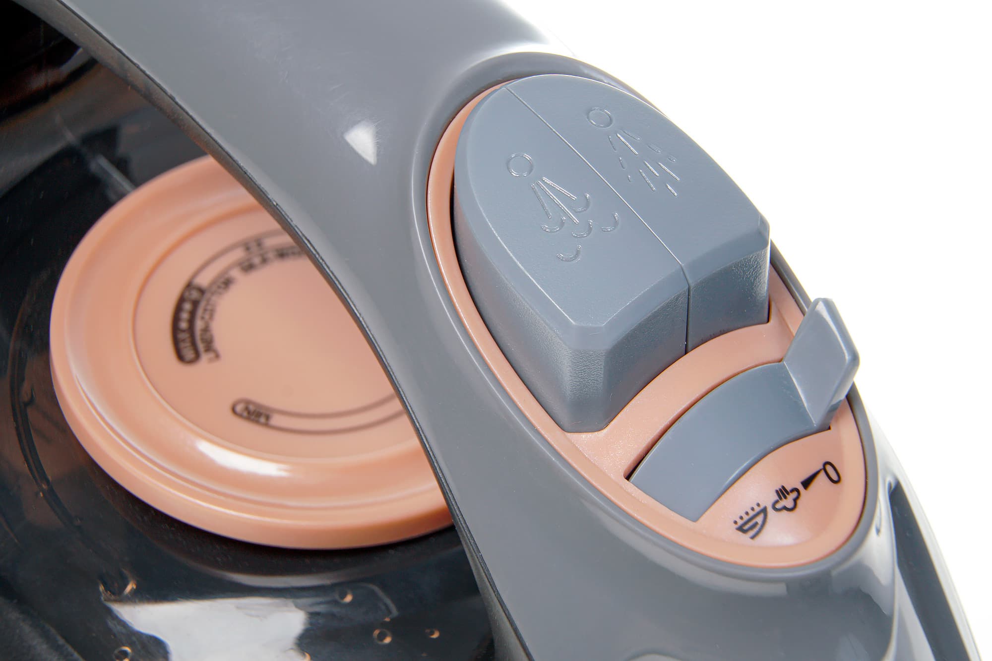 Ручка в месте соприкосновения с ладонью пользователя не покрыта Soft Touch, но в руке не скользит, пластик, в отличие от верхней части ручки, не гладкий. Клавиши парового удара и разбрызгивания находятся в привычном месте, без особых усилий надавливаются большим пальцем. Чуть выше виден переключатель режима подачи пара. Двигаясь далее к носику, можно найти крышку, накрывающую отверстие для заливки воды и сопло разбрызгивателя — как мы и говорили, конструкция обычная.