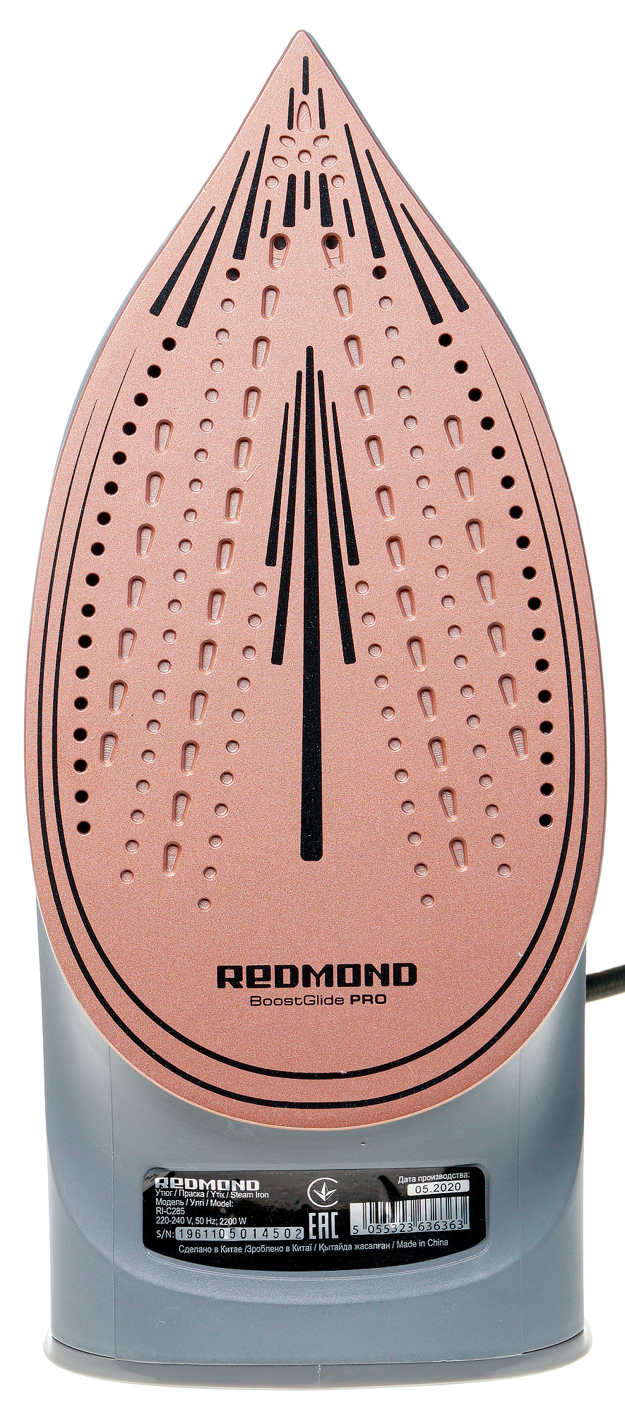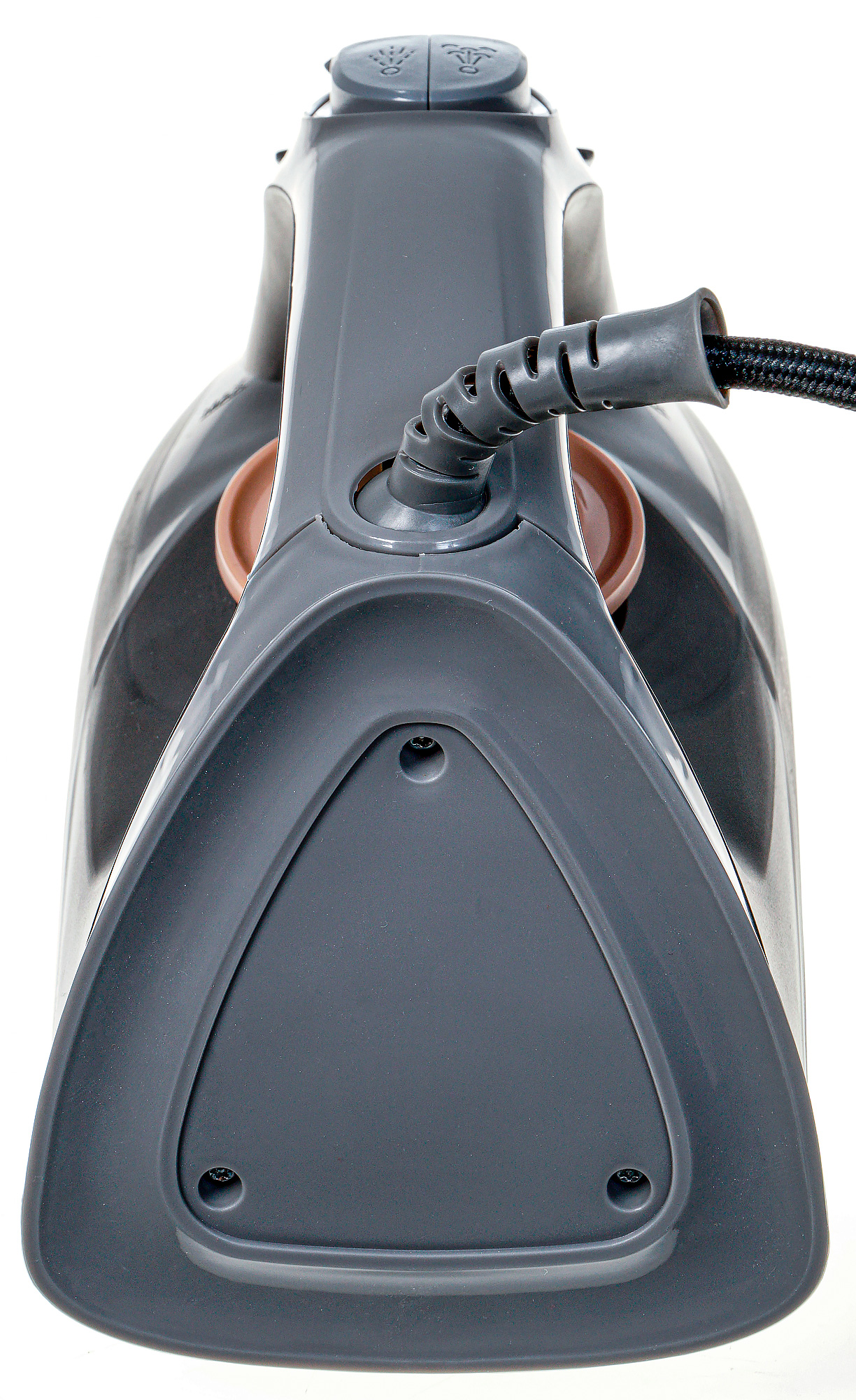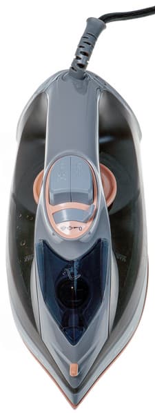 В нижней части корпуса со стороны подошвы видим наклейку с краткой технической информацией об утюге. Подошва сделана в форме капли. Зауженная вершина имеет острую форму. Отверстия выхода пара расположены в один ряд вдоль боковых граней подошвы и в ее верхней части. Мы бы не назвали покрытие идеально гладким, на ощупь оно чуть-чуть шершавое. Нанесено ровным слоем, но при внимательном осмотре найдена пара мелких зазубрин.