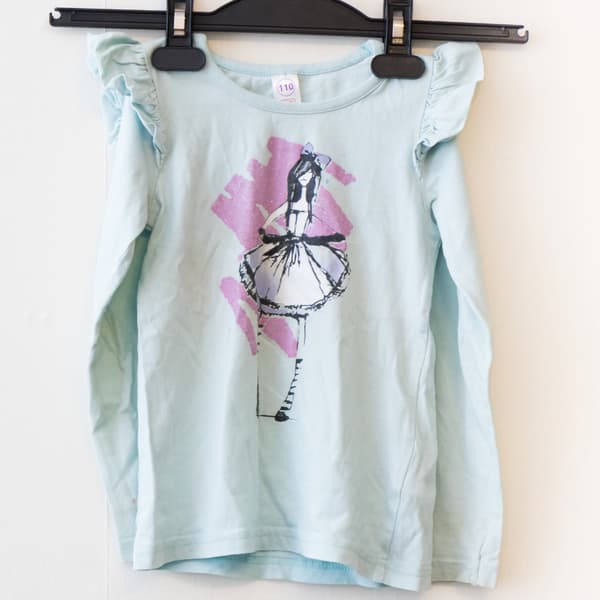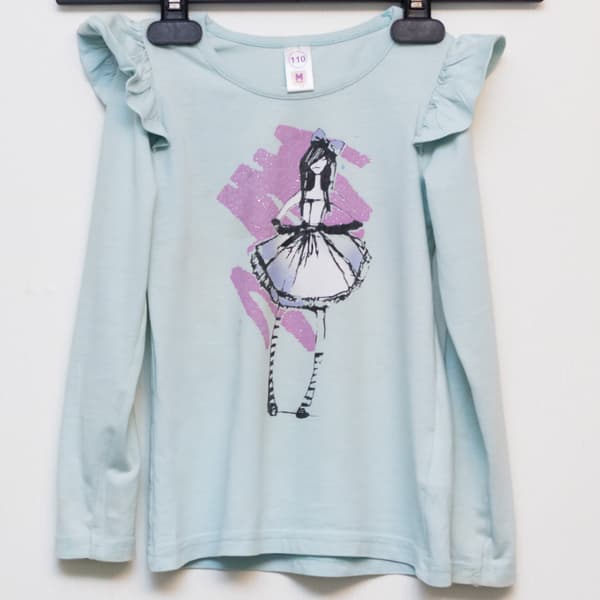 В качестве футболки с принтом у нас сегодня выступает детский хлопчатобумажный лонгслив с не просто принтом, но с изображением, усеянным блестками. К тому же у пройм рукавов имеются своеобразные «крылышки», что позволит нам оценить форму подошвы при уходе за сложными деталями одежды.