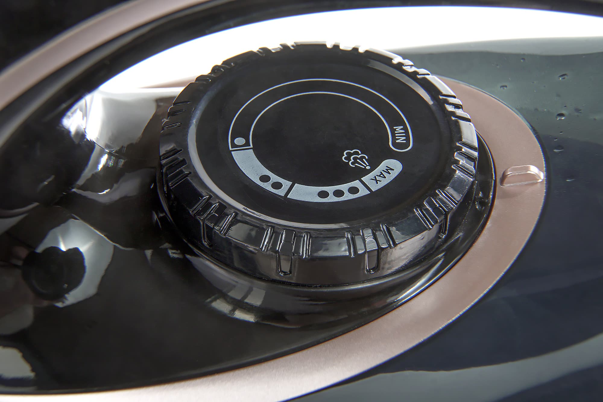 Ручка пластиковая, никаким покрытием не обработана, но в ладони не скользит. Внешняя сторона ручки в месте соприкосновения с ладонью пользователя негладкая, на поверхности нанесен ребристый узор. Кнопки парового удара и разбрызгивателя находятся в привычном месте, при работе оказываются ровно под большим пальцем. Далее, ближе к носику, можно видеть регулятор мощности подачи пара, откидную крышку, защищающую отверстие для наполнения резервуара водой, и сопло разбрызгивателя.
