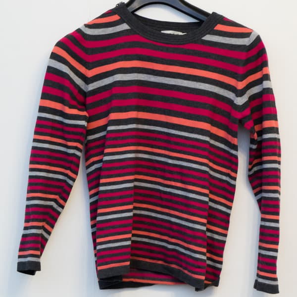 Расправить сухую и с заломами хлопчатобумажную ткань платья нам не удалось. В принципе, мы и не ожидали блестящего результата, поскольку паровыми ударами лучше всего обрабатывать не мятые вещи, а одежду, долго провисевшую в шкафу и потерявшую свежий вид. Неплохо пропариваются с помощью утюга трикотажные вещи. Поэтому мы попробовали привести в приличный вид трикотажный пуловер. Ткань плотная, немного мятая.