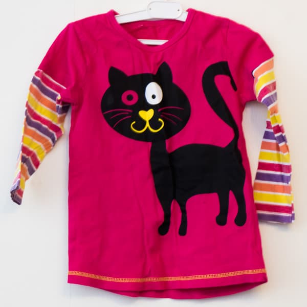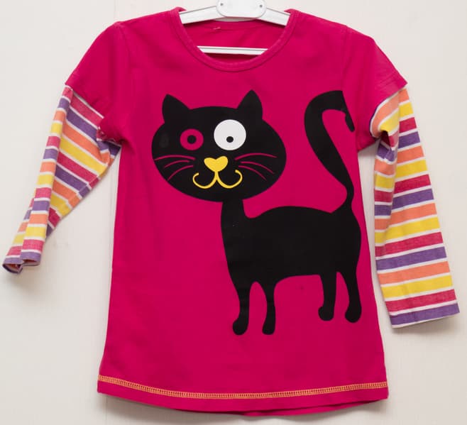 В качестве футболки с принтом мы используем детский хлопчатобумажный лонгслив — принт занимает практически всю переднюю полочку. Помимо того, вещь небольшая, сильно мятая, изготовлена из трикотажа, который легко тянется. Так что заодно мы сможем оценить форму подошвы и возможности ухода за тянущимся полотном.