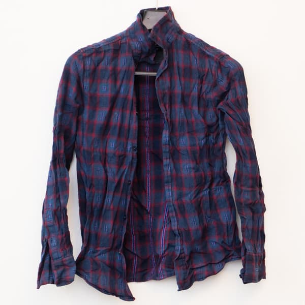 Рубашка сильно замята и пересушена от долгого хранения, поэтому обрабатывали ее при максимальной температуре нагрева подошвы и постоянной мощной подаче пара. Помогло нам то, что данный тип ткани относится к легко разглаживаемым.